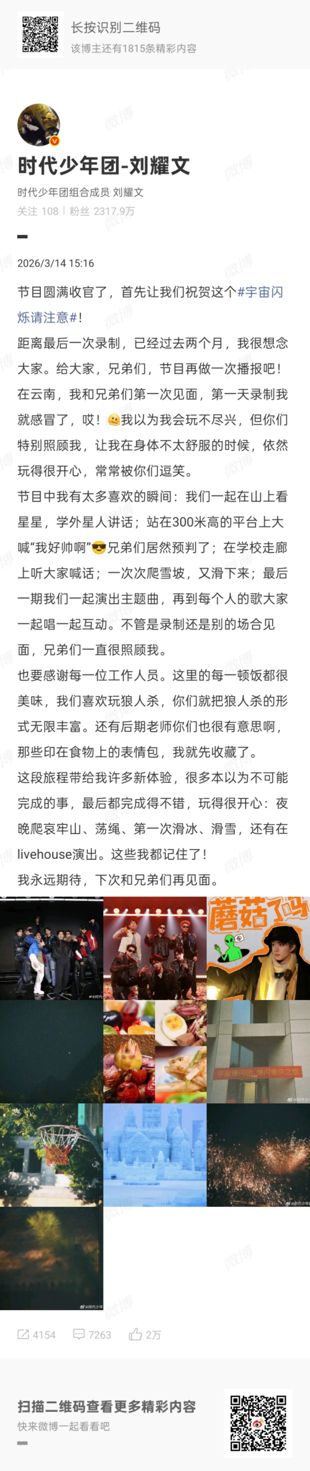 刘耀文给节目再做一次播报刘耀文宇闪的每一顿饭都很美味 看刘耀文收官播报被戳到,感谢每一位工作人员的付出,还提到喜欢玩狼人杀节目组就丰富玩法。宇闪的每一顿饭都很美味这句太真实了,后期老师的表情包他也都收藏了。