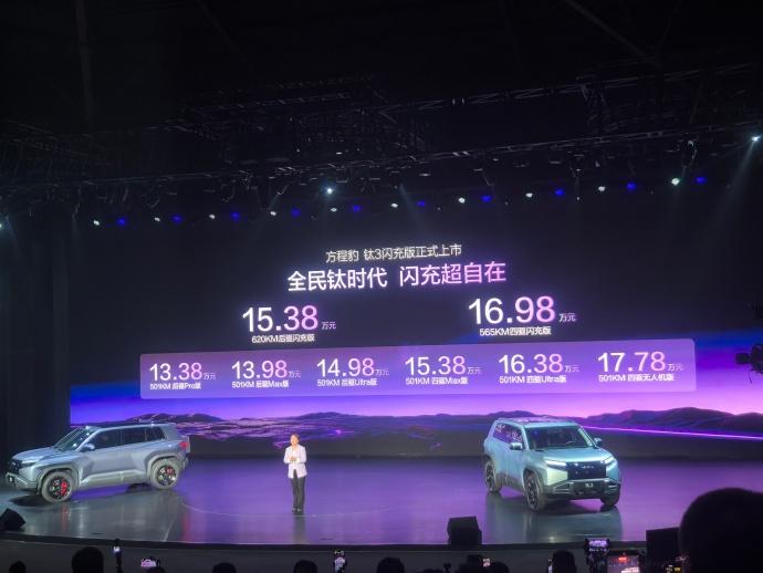 本次亲临现场发布会!方程豹闪充版这波真的杀疯了!钛3闪充版刚上市,15.38万起售,直接要当A级纯电市场的“规则改变者”,黑科技打造豹力新体验。 先说最狠的黑科技——5分钟,电量从10%冲到70%!你没看错,就是一杯咖啡的时间。零下30度也就多等3分钟,配合全国4597座闪充站,从此告别续航焦虑。 这价格,性能却硬核到离谱。百万级同款悬架+云辇-C,方盒子也能精准操控;CTB车身技术让刚度比肩豪车。标配即高配:天神之眼智驾、AI座舱、座椅通风...简直是把配置表打满了。 个性化这块也拿捏了,“星尘紫”外观、“灰蓝双拼”内饰,还有星际战车座舱,还有全新配色和超多潮改选择。想要长续航选620km后驱版;贪心一点想要帝瓦雷音响和压缩机冰箱?四驱版也就16万多。 一句话:这个价格,这个补能速度,这个配置,钛3就是今年最值得冲的纯电方盒子,没有之一!