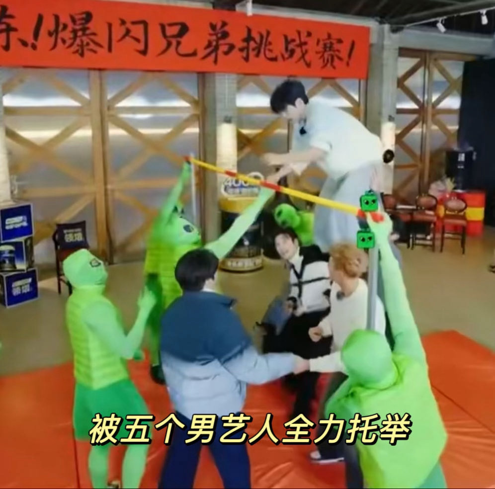邵子恒被五个男艺人全力托举节目组:这个高度我们没成功过。邵子恒:那我试试。然后他就被五个男人托着飞过去了!脑子转不转弯不重要,能跨过2米3的栏杆就是真男人!
