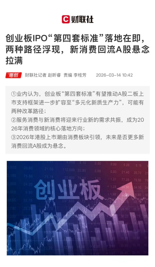 『 要点:① 业内认为,创业板“第四套标准”有望推动A股二板上市支持框架进一步扩容至“多元化新质生产力”,可能有两种改革路径; ② 服务消费与新消费将迎来行业新的需求共振,成为2026年消费领域的核心落地方向; ③2026年港股上市潮由消费板块引领,未来是否更多新消费回流A股成为悬念。 』