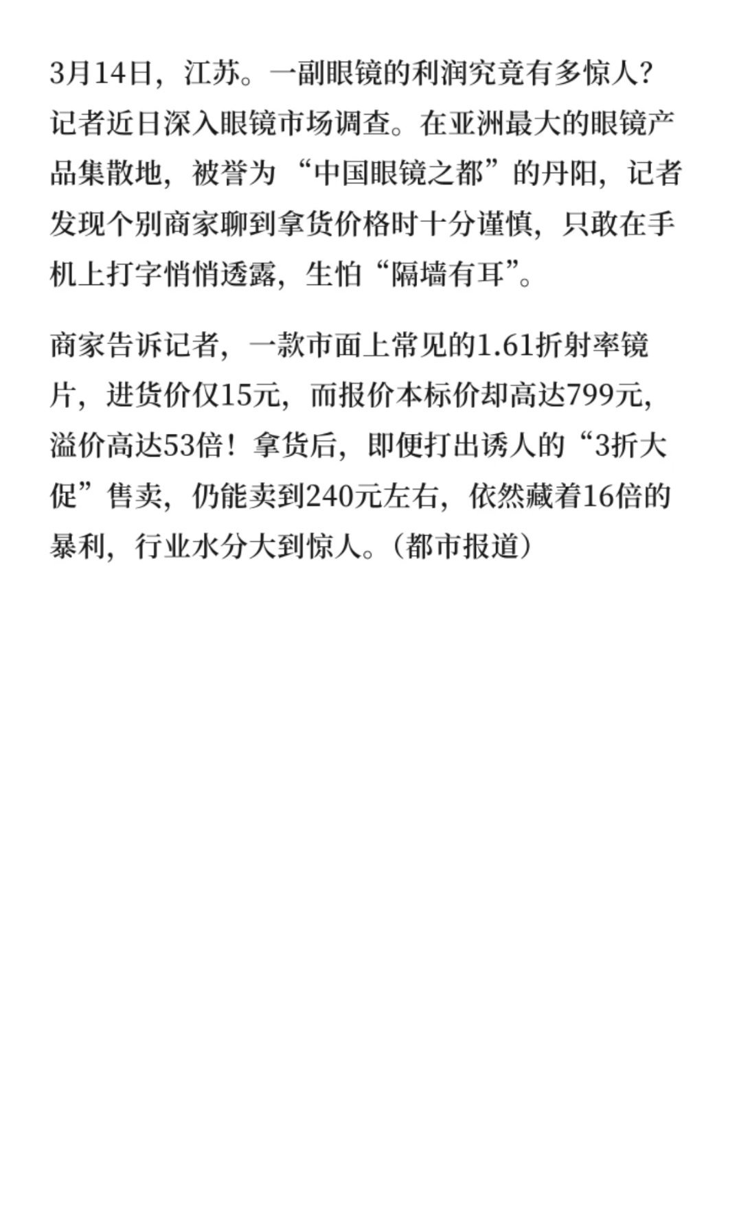 315调查眼镜到底有多暴利看到有媒体调查,标价799的镜片进货价仅有15块,溢价高达53倍!我之前也算是在眼镜👓行业呆过,开店+用工成本其实还是蛮高的,眼镜又属于耐消品,单看价格确实是暴利,至于综合算下来…