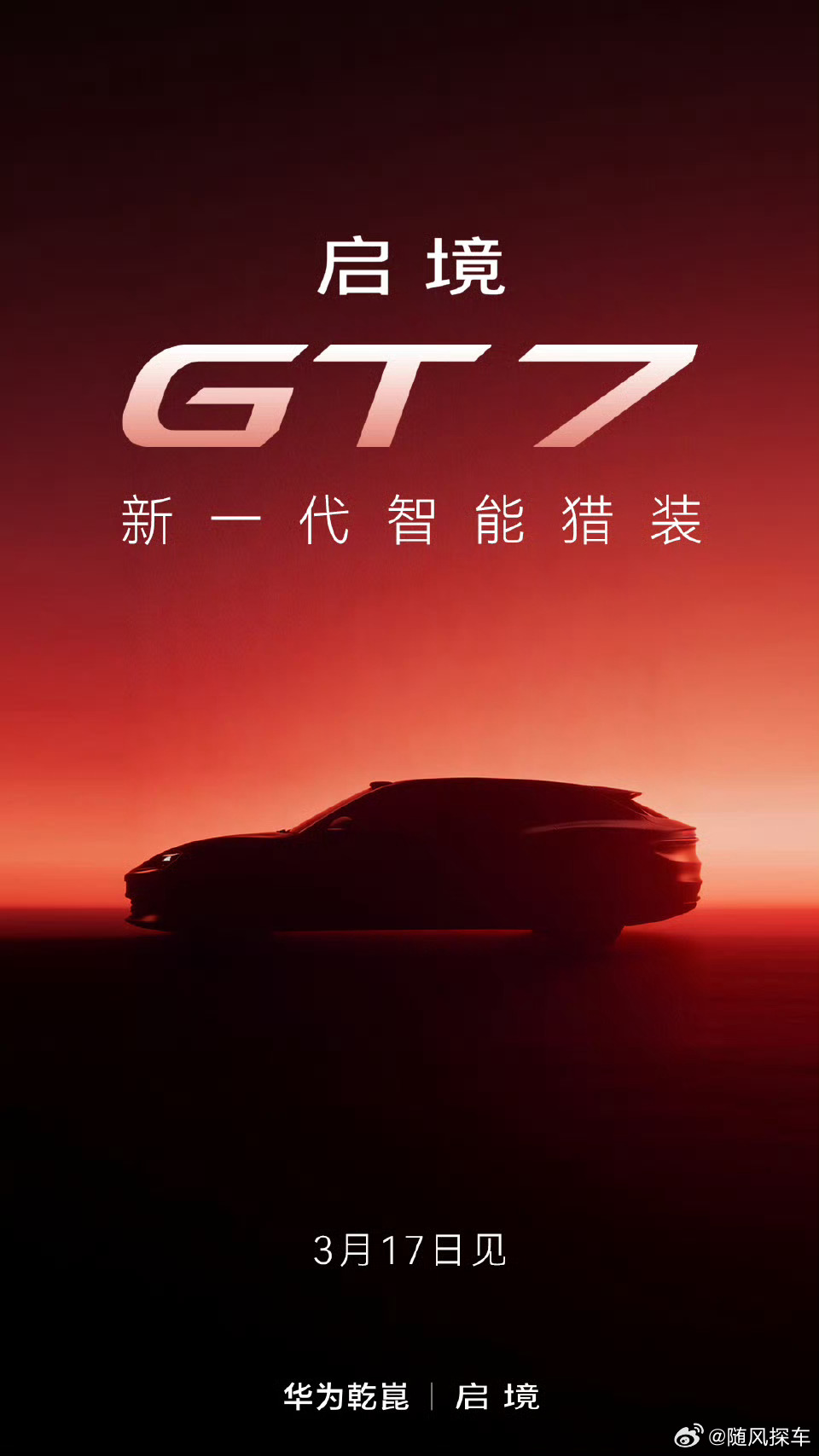 317启境GT7全球首秀今日,启境汽车正式官宣:3月17日,启境品牌发布暨启境GT7 全球首秀将在广州南沙举办。作为华为乾崑“境”系列的开篇之作,启境汇聚广汽顶尖智造实力与华为乾崑前沿智能科技,以深度协同实现技术与产业的强强融合。发布会上,首款车型启境GT7将同步全球首秀。新车定位新一代智能猎装,以智能与驾趣融合,为用户带来智能出行新篇章。