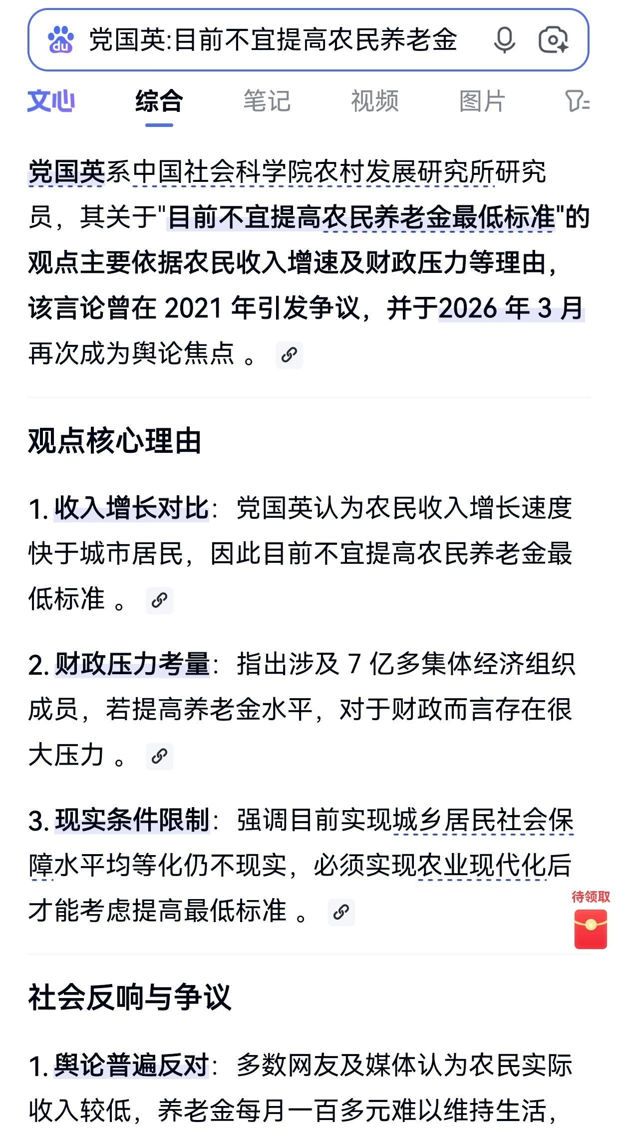 党国英作为一名中国社会科学院农村发展研究所研究员,其在2021年曾提出"目前不宜提高农民养老金最低标准"的观点,主要依据农民收入增速及财政压力等理由。 今年的这时候,党国英的这种说法再次成为舆论焦点 。在社会大众普遍认为农民养老金偏低的大环境下,党国英研究员一句简简单单地“农民收入增长快于城市国民”,并不足以直接作为国家是否提高农民养老金的判据。 事实上,我们国家高层领导始终重视民生保障,2026年城乡居民基础养老金已上调20元,让更多城乡老人生活更有底气。