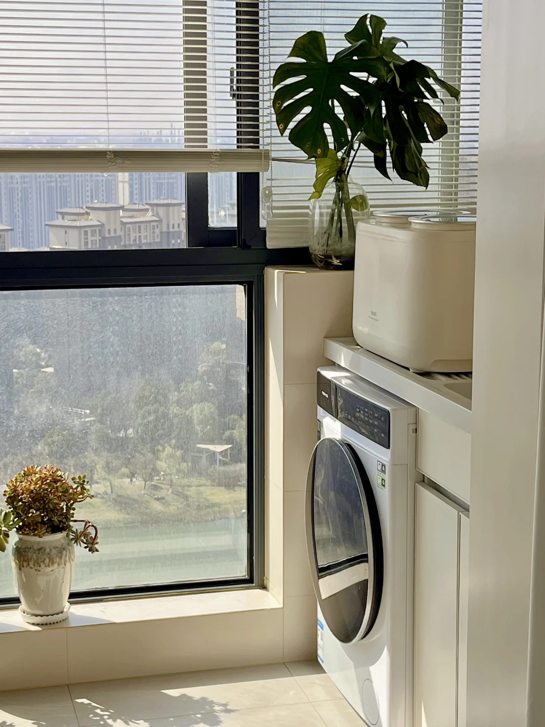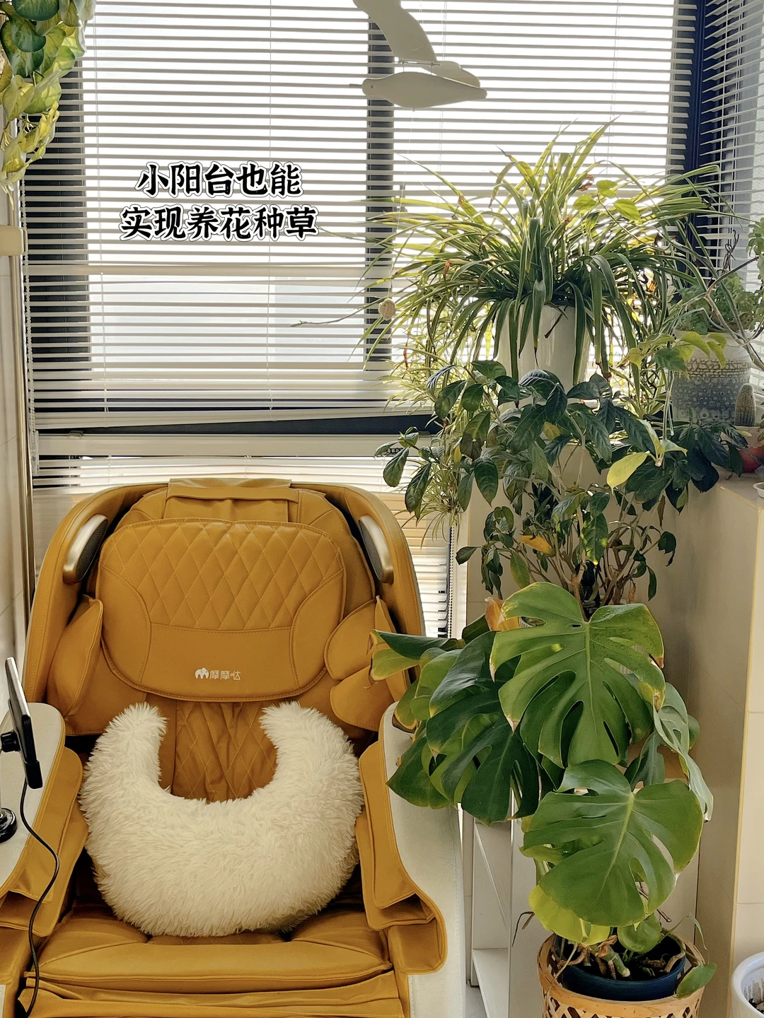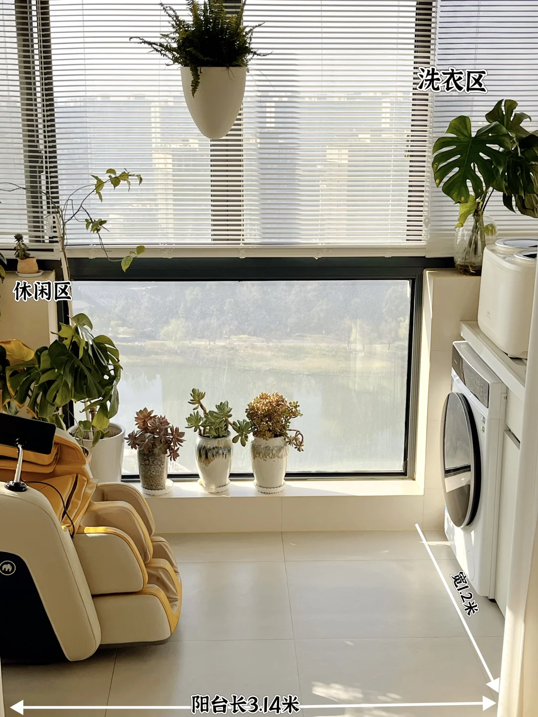 我家阳台特别小只有4平,但经过合理规划,一样能拥有洗衣区,休闲区,种花区~ 💺休闲区: 休闲区我安排的一个按摩椅,不规则阳台台面种满花草,累了一天往上面一躺真的舒服又惬意~ 👚洗衣区: 洗衣区我定制了一个太空铝洗衣机柜耐晒又便宜费用1300,为了彻底解放双手安排了一大一小洗衣机的特别是最近刚入手的偶点双子星洗衣机真的巨香,简直就是我们抗癌的福音~ 每天洗完澡把贴身衣物往里一丢别提有多爽了,它是左右双筒设计,分舱独立清洗,内衣、内裤、袜子分开洗护,彻底告别混洗烦恼,还带高温杀菌功能,杀🦠率高达99.99%,贴身衣物穿起来更安心。 而且内筒是不锈钢材质,贴身衣物洗着也会更放心,完全不用担心交叉感染。小件衣物不缠绕、不变形,洗得干净又护衣, 它的体积小刚好放在大洗衣机上面,而且是静音电机,我家阳台是在主卧晚上洗衣也不打扰到睡觉~ 阳台虽小,但舒服性却能拉满,今天阳台篇就分享到这,还有哪里需要了解的姐们评论区见💁‍♀️