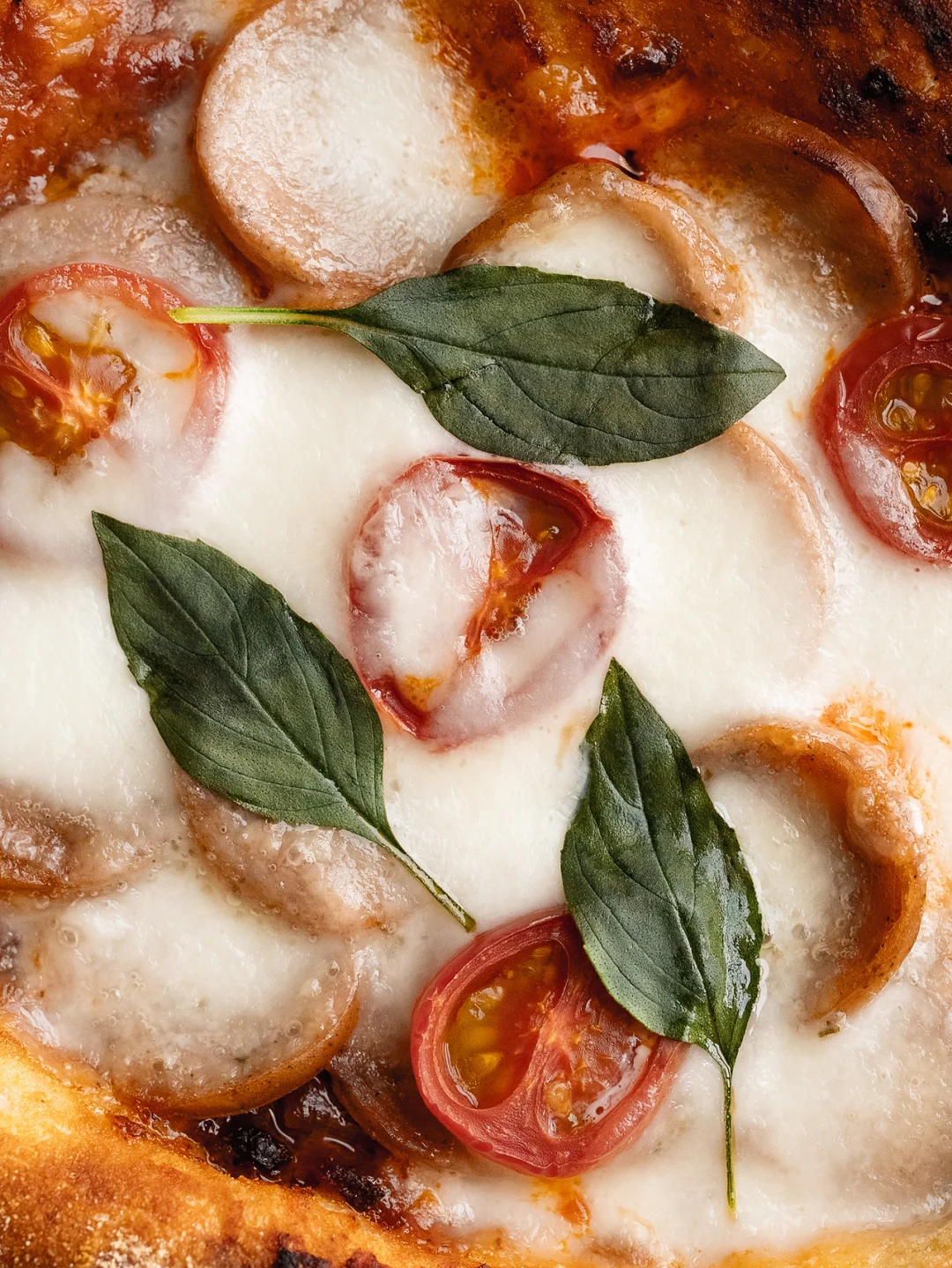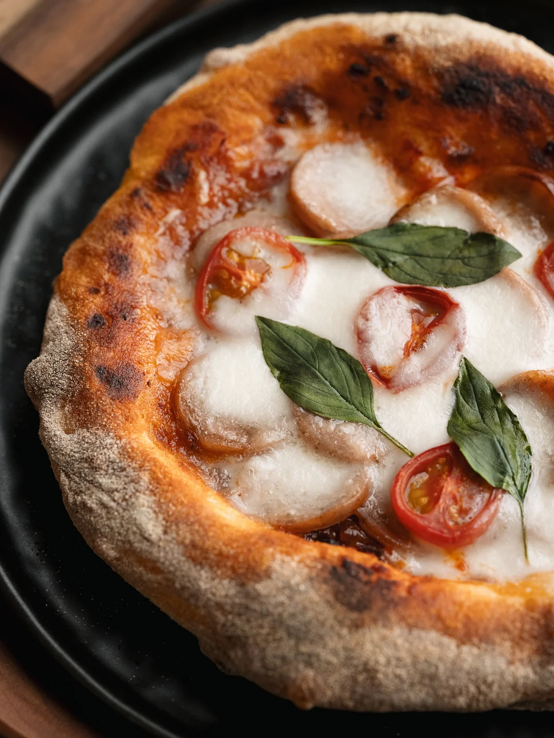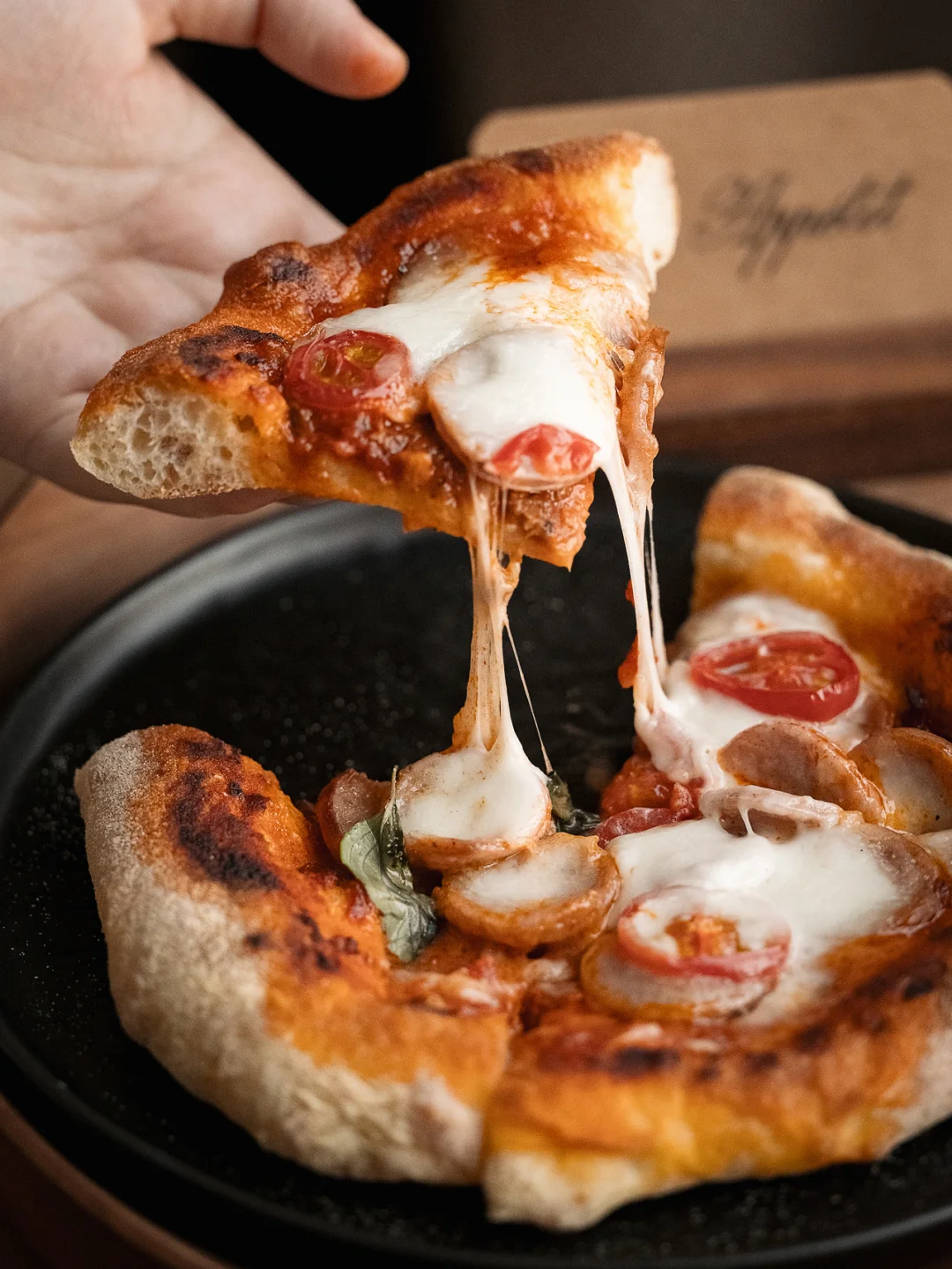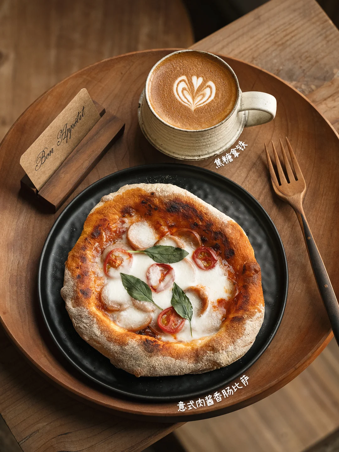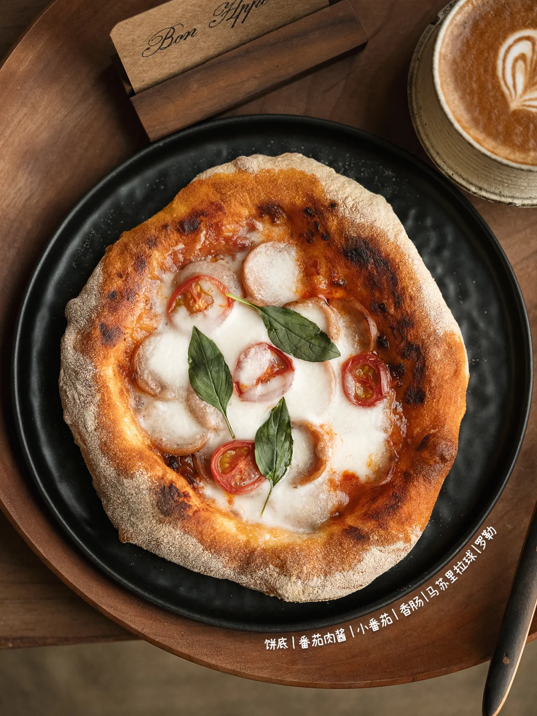 🍕意式肉酱香肠比萨 ☕️焦糖拿铁 - 🍕意式肉酱香肠比萨 ❶130g水|180g高筋粉|1g干酵母|2.5g盐 翻拌成无干粉面团,盖保鲜膜静置20分钟 ❷往中间翻折,再静置20分钟(此步骤重复两次) ❸面团裹满玉米粉,拉伸成饼皮,抹番茄肉酱 ❹烤箱预热230度,先烤7分钟定型 ❺取出放上香肠芝士和小番茄,再烤6分钟 ❻出炉后点缀罗勒叶 -