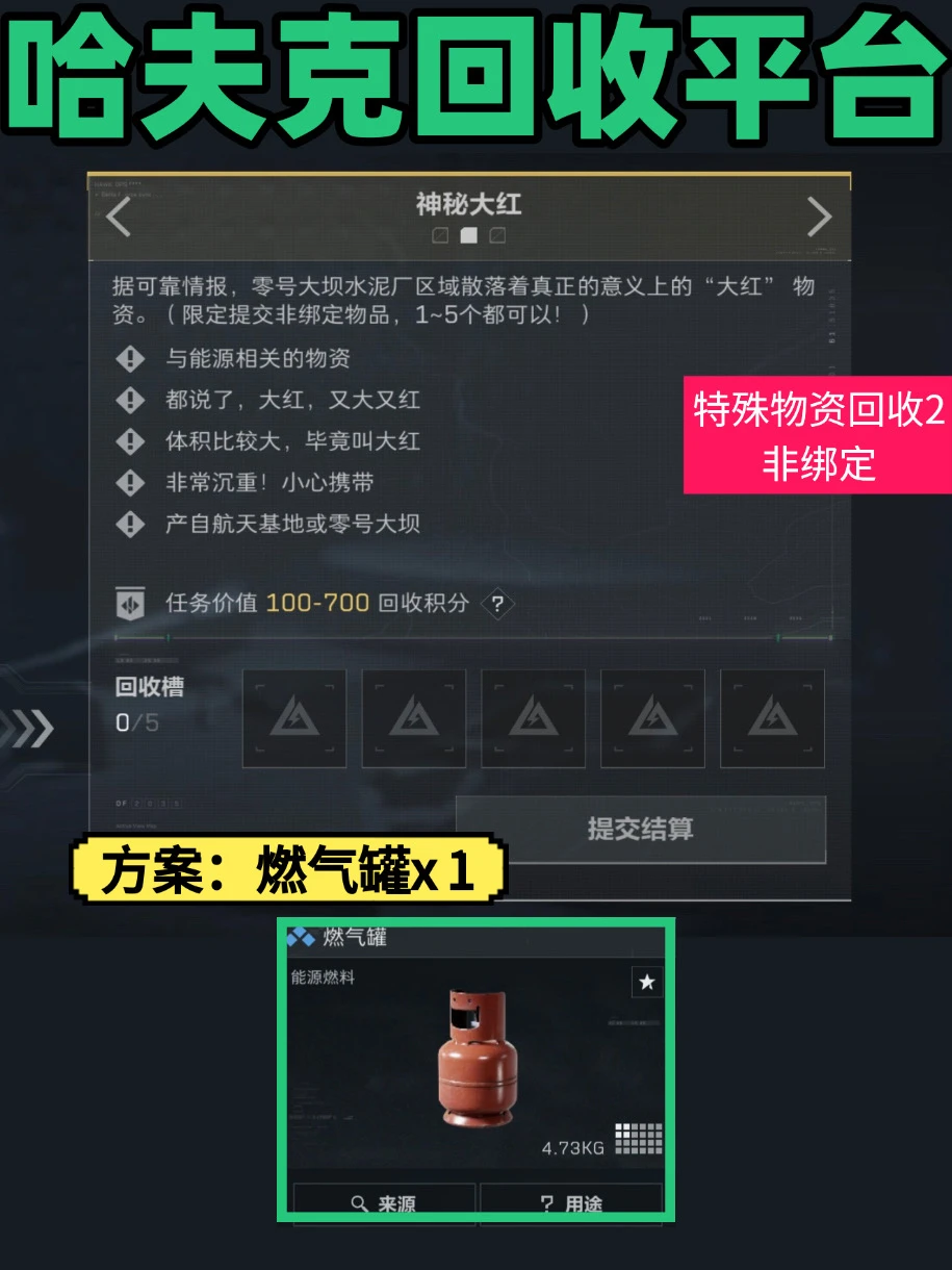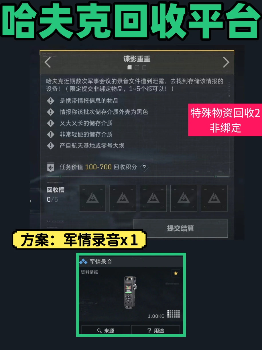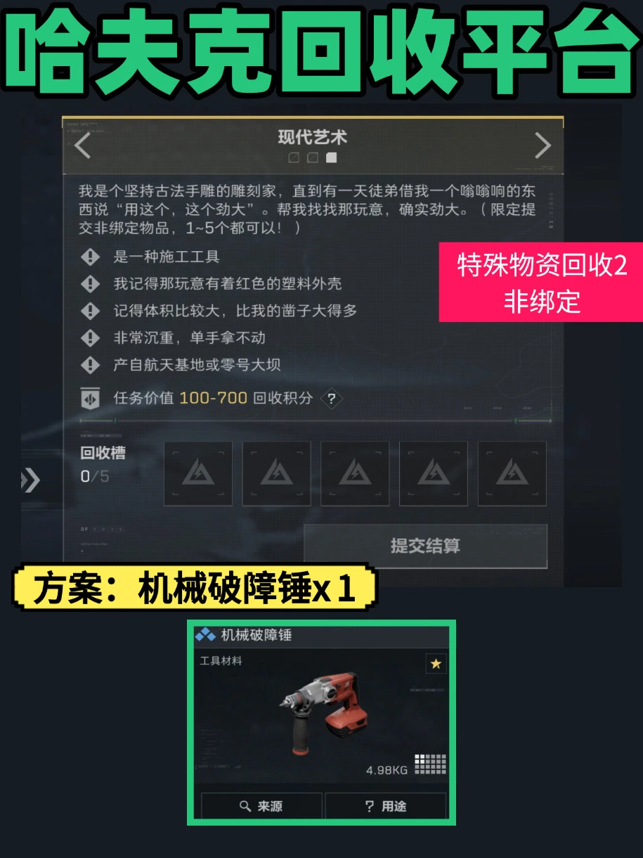 ⚠️谍影重重 方案1️⃣:军情录音(零号大坝办公区、航天基地情报点、收纳盒高概率刷新) 逃课2️⃣:私密笔记簿 + 签章联运单 + DVD光驱。 🌹神秘大红 方案1️⃣:煤气罐(零号大坝水泥厂区域、航天基地常见) 逃课2️⃣:多用途电池 + 可乐/英式袋泡茶 + 一包水泥🎨现代艺术 方案1️⃣机械破障锤(航天基地、零号大坝施工区域常见) 逃课2️⃣:红色电线/可乐 + 水泥/油漆。