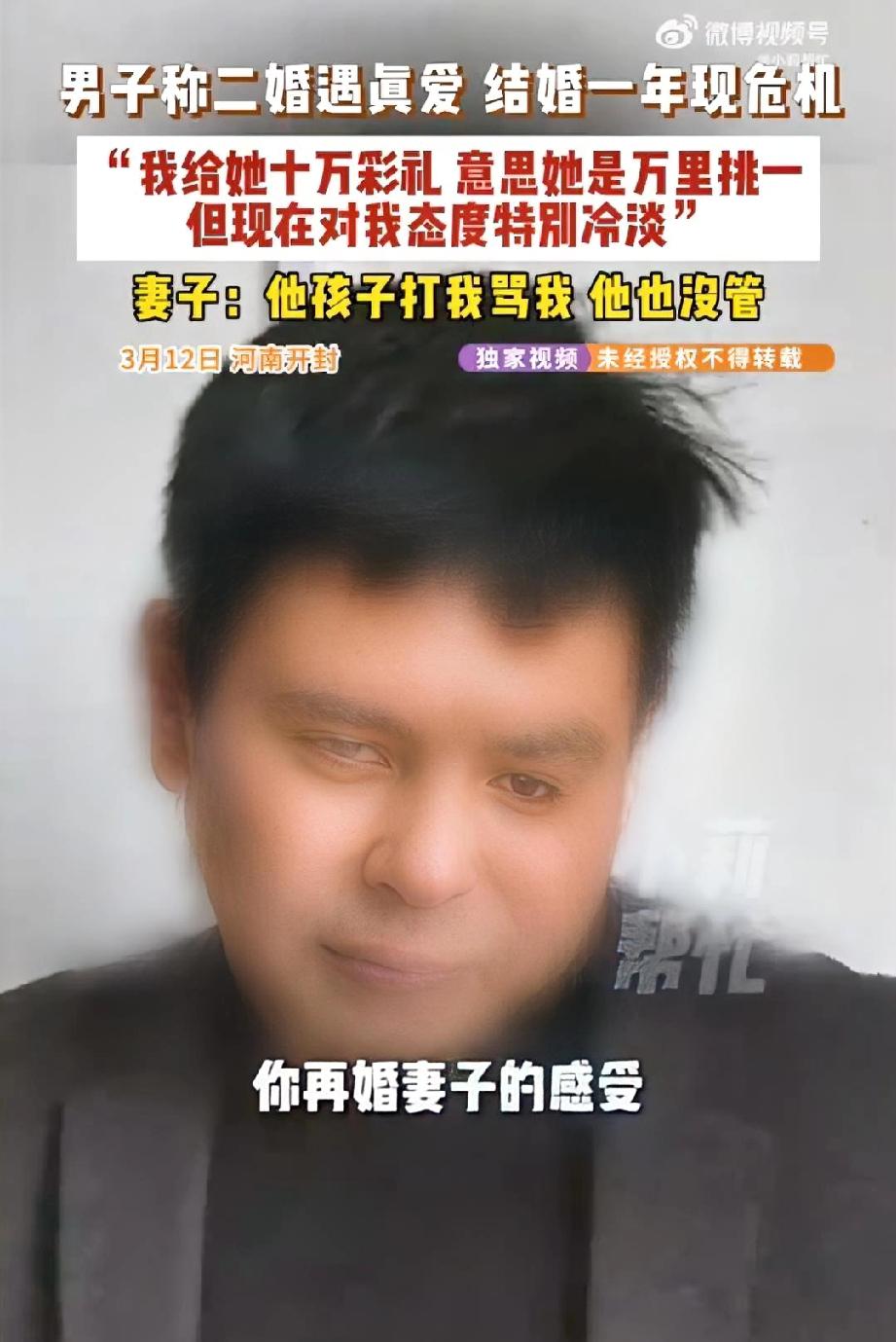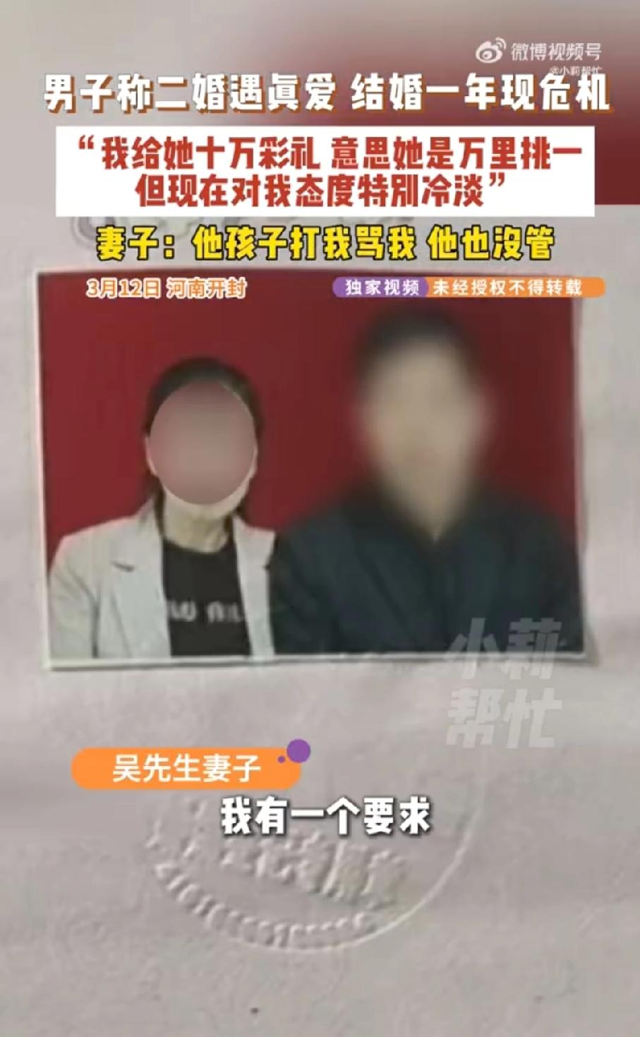 “我给她10万彩礼意思是万里挑一,但现在对我特别冷淡”男子二婚以为遇到真爱却在采访中狂扇自己耳光! 这事情发生在河南开封,56岁的吴先生本以为花了10万彩礼迎娶50岁的妻子是“万里挑一”的真爱,却在结婚一年后情绪崩溃,对着镜头狂扇自己耳光,痛哭后悔。然而,他的妻子也满腹委屈,哭诉在夫家“连条狗都不如”,被丈夫的孩子们打骂,甚至被用板凳砸头。 2026年3月12日,河南开封的吴先生找到了当地知名的调解栏目《小莉帮忙》。在镜头前吴先生情绪失控,当场狂扇自己耳光。他哽咽着说,自己为了这段婚姻付出了10万元彩礼,寓意着对方是自己的“万里挑一”,他还将自己的房子抵押50万给妻子开超市,本以为迎来了人生的“第二春”,没想到结婚才一年,妻子就对他态度冷淡,如今更是直接离家出走,让他感觉“人财两空”,悔不当初。 面对吴先生的崩溃与指责,电话那头的妻子却是另一番说辞。50岁的妻子听到丈夫的指控后,情绪同样激动,她带着哭腔向记者倒出了满肚子的苦水。她直言在那个家里,自己不仅没有被当作女主人,反而备受欺凌。“他几个孩子打我骂我,他也没管!”妻子控诉道,丈夫的孩子们不仅对她恶语相向,甚至动了手,大闺女曾指着她的鼻子辱骂,更过分的是,还有人拿起板凳直接砸在了她的头上。在这个家里,她感受不到一点温暖和尊重,心寒地表示:“在他家,我还不如一条狗”。 为什么吴先生的孩子要打骂这位后妈呢?原来是子女们非常反对父亲抵押房子给继母开超市。在孩子们眼中,父亲这无异于被“爱情”冲昏了头脑,他们担心这50万会打了水漂,更担心继母是另有所图。 就是因为这一矛盾最终引发了肢体冲突,事情发展到这一步,妻子给出了回家的唯一条件:让那几个动手打过她、骂过她的孩子,正式向她道歉。而面对这个条件,吴先生也当场表示同意。 这场矛盾很明显是吴先生在这场子女与妻子的混战中,没能扮演好“润滑剂”和“保护者”的角色,吴先生作为一个丈夫,他的妻子被孩子用板凳砸头时,他在哪里?当妻子感到在这个家“不如一条狗”时,他又做了什么? 作为一个父亲在处置这种大额财产时,尤其是二婚家庭,就必须与自己的子女在内的所有家庭成员进行沟通交流,这是彼此尊重与信任,很显然吴先生也没有做好这一点。不管怎么说,暴力解决不了问题,遇事还是应该多沟通交流才是。