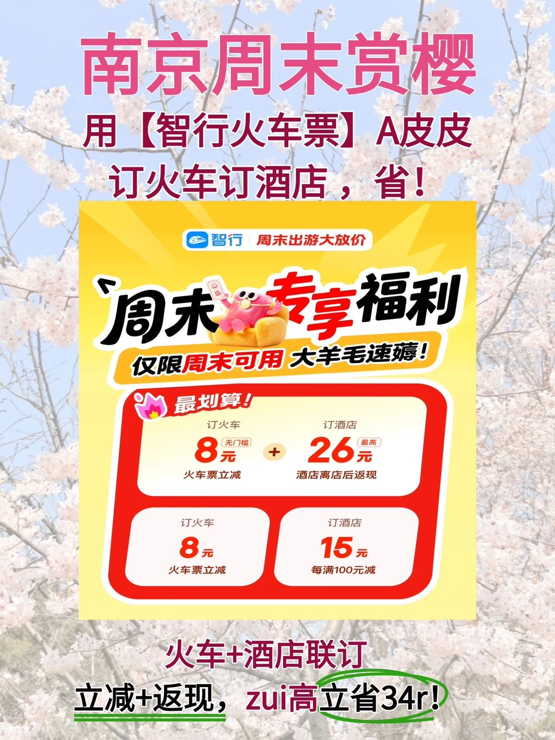 假期刚过去正愁出行没什么活动,发现👉【智行火车票】A皮皮周末出游(周五-周日)好省钱!周末去赏樱,以下权益三选一快快领~