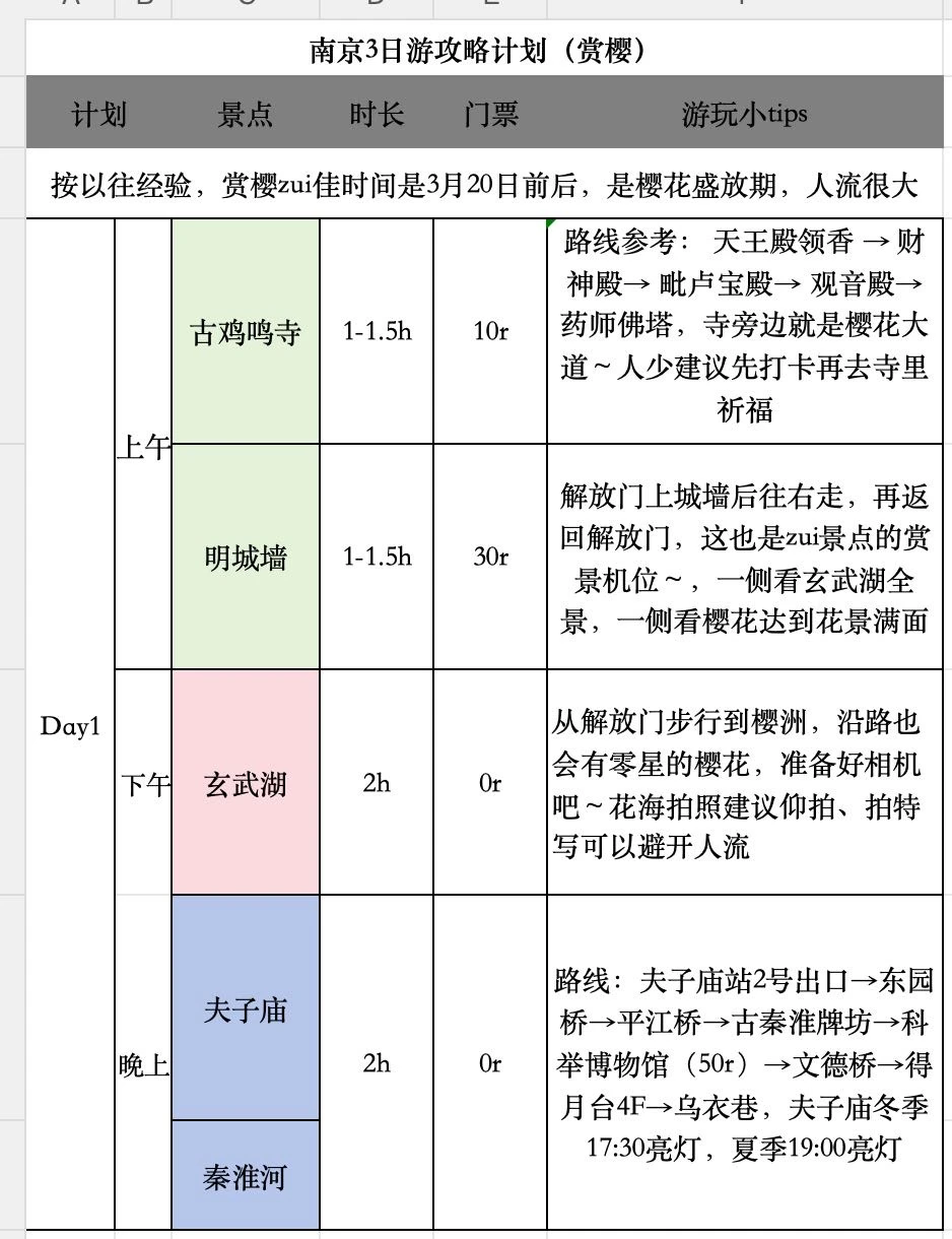 Day1️⃣:古鸡鸣寺(樱花大道)→明城墙→玄武湖(樱洲赏樱)→夫子庙秦淮河