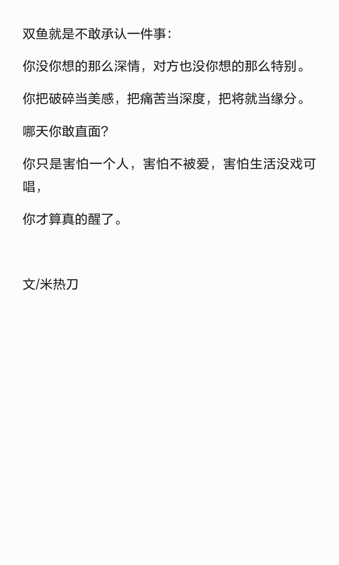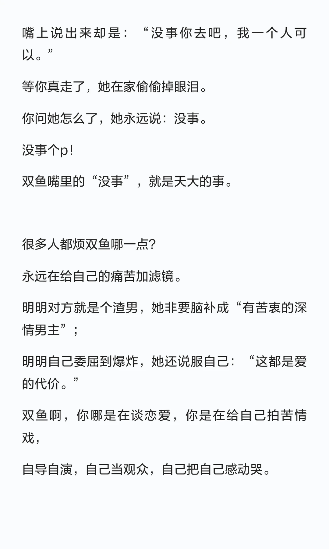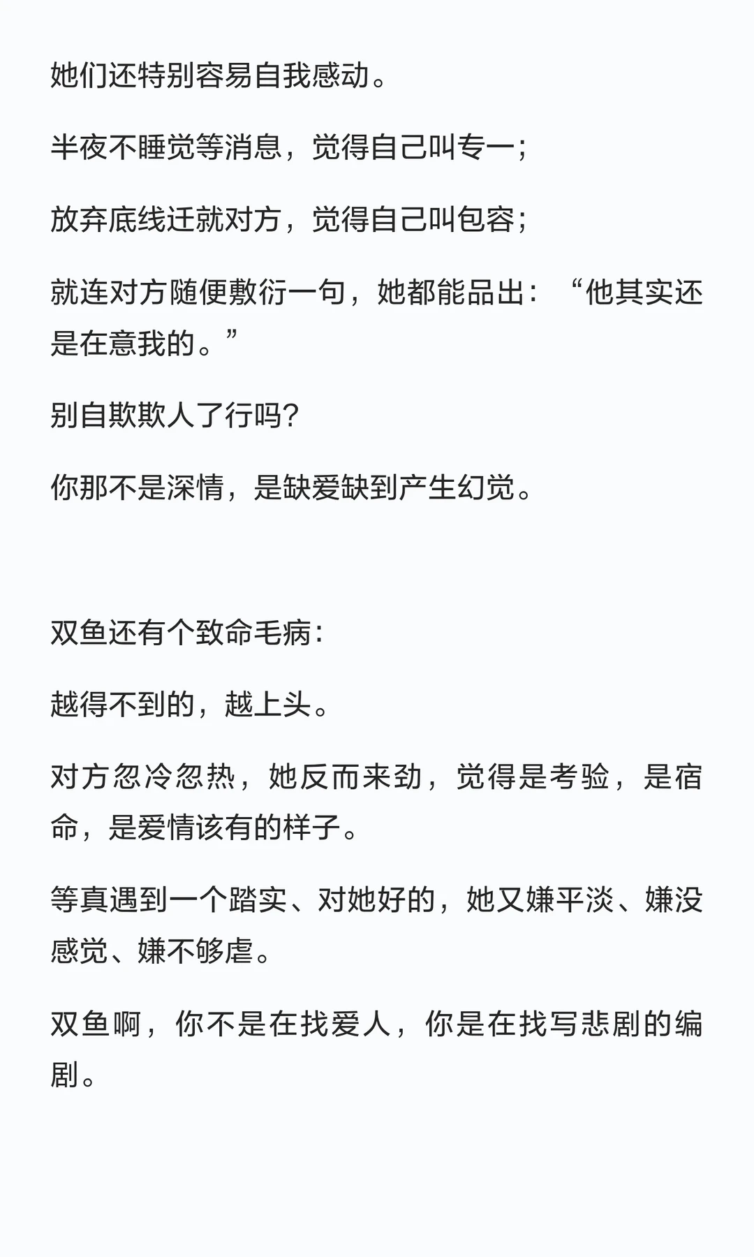 双鱼座在感情中常自我欺骗,为爱牺牲却忽视痛苦,她们习惯自我感动,即使对方不真诚,也脑补成深情。双鱼敢于直面一个人、不被爱,才能觉醒。