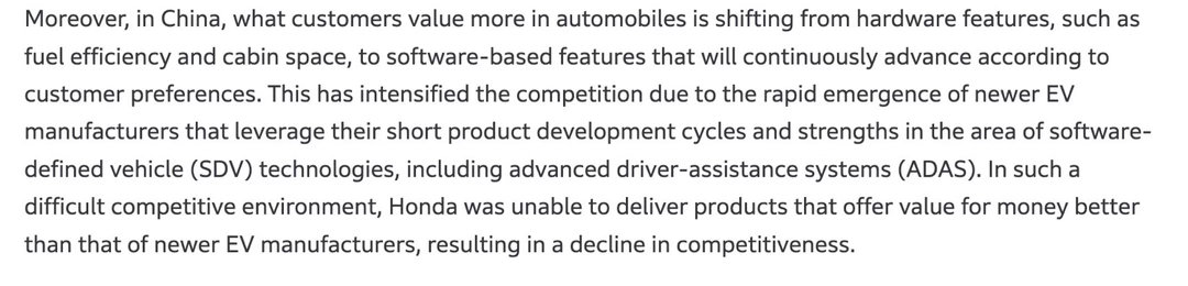 在这样的环境下,本田未能推出在性价比上超越新兴厂商的产品,竞争力因此下降。”