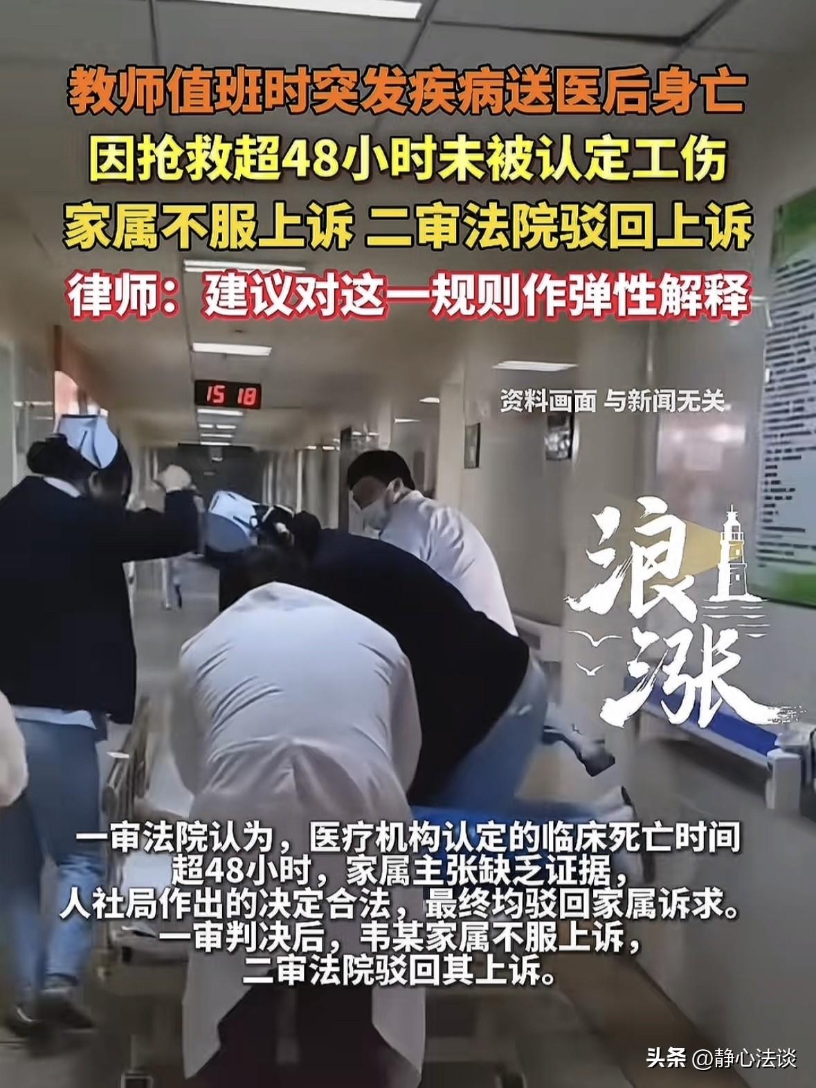 广西贵港,一名小学教师,在值班途中突发脑出血,被发现后被送到医院抢救,手术后在ICU抢救74小时后,还是不幸离世,事后,家属申请工伤,却因超过48小时未被认定,家属无法接受,于是将人社局告上法庭,万万没想到起诉一审二审均败诉。网友:难道离世还要卡时间?非要在48小时内走掉才算工伤? 韦某是一名小学教师,在一次值夜班时,突然头晕目眩晕倒在卫生间里。 等同事发现时,人已经失去意识,急忙打了120送到了医院。 经检查,韦某是突发脑出血,情况危重,必须马上开颅手术。 术后,人直接送进ICU,靠呼吸机和药物吊着最后一口气。 医生很直白地告诉家属,脑干损伤太重,能不能醒过来全看天意,总之活下去的希望很小。 家属咬着牙说,只要有一口气在,只要还有一线希望,就绝不拔管、绝不停止治疗。 三天三夜,74个小时,家属守在ICU门外,每一分每一秒都是煎熬。 可无论大家多努力,还是没能把人从鬼门关拉回来。 好好一个人,说没就没了,家属悲痛万分,事后家属觉得韦某是在学校出的事,怎么看都该算工伤。 于是向人社局提交工伤认定,万万没想到,对方回复不予认定工伤。 理由是韦某抢救时间超过了48小时的时间标准。 家属当场就懵了,别说是他们,就是换作任何一个人,那种情况都不可能说放弃。 他们不服气,一纸诉状把人社局告上法庭,想要讨一个公道。 一审法庭上,家属提出韦某从发病到出现脑功能衰竭,前后还不到24小时,大脑已经坏死。 后面几十小时的抢救,不过是靠仪器勉强维持身体的基本反应,根本算不上真正的活着。 《工伤保险条例》第15条:职工在工作时间和工作岗位突发疾病死亡,或者在48小时之内经抢救无效死亡的,才视同工伤。 可规定只认医院出具的临床死亡时间,而韦某抢救了74小时,已经超过了规定时间。 至于家属提到的脑死亡、早已无自主呼吸,不被作为死亡认定的依据,于是驳回了家属的诉求。 家属不认可,于是提起了上诉,可二审法院审理后,认为一审认定没问题,于是驳回上诉,维持原判。 法律是死的,可人是活的,这条消息一发,评论区直接炸锅了。 无数网友气得睡不着,纷纷留言表达气愤和不解。 有人说,这规定太没人情味了,难道要逼着家属在48小时内放弃抢救,才能换一个工伤认定? 救亲人是本能,保待遇是生存,为什么非要让人在这二选一。 有人直言,韦某是在值班时出事的,完完全全是因工发病,不管抢救多久,都是为了工作付出的生命,就该认定工伤。 还有人说,规则是为人服务的,不是用来卡人命的,这判决太寒人心了。 对此,你怎们看这件事! @静心法谈 学法辨是非,慬法不吃亏。