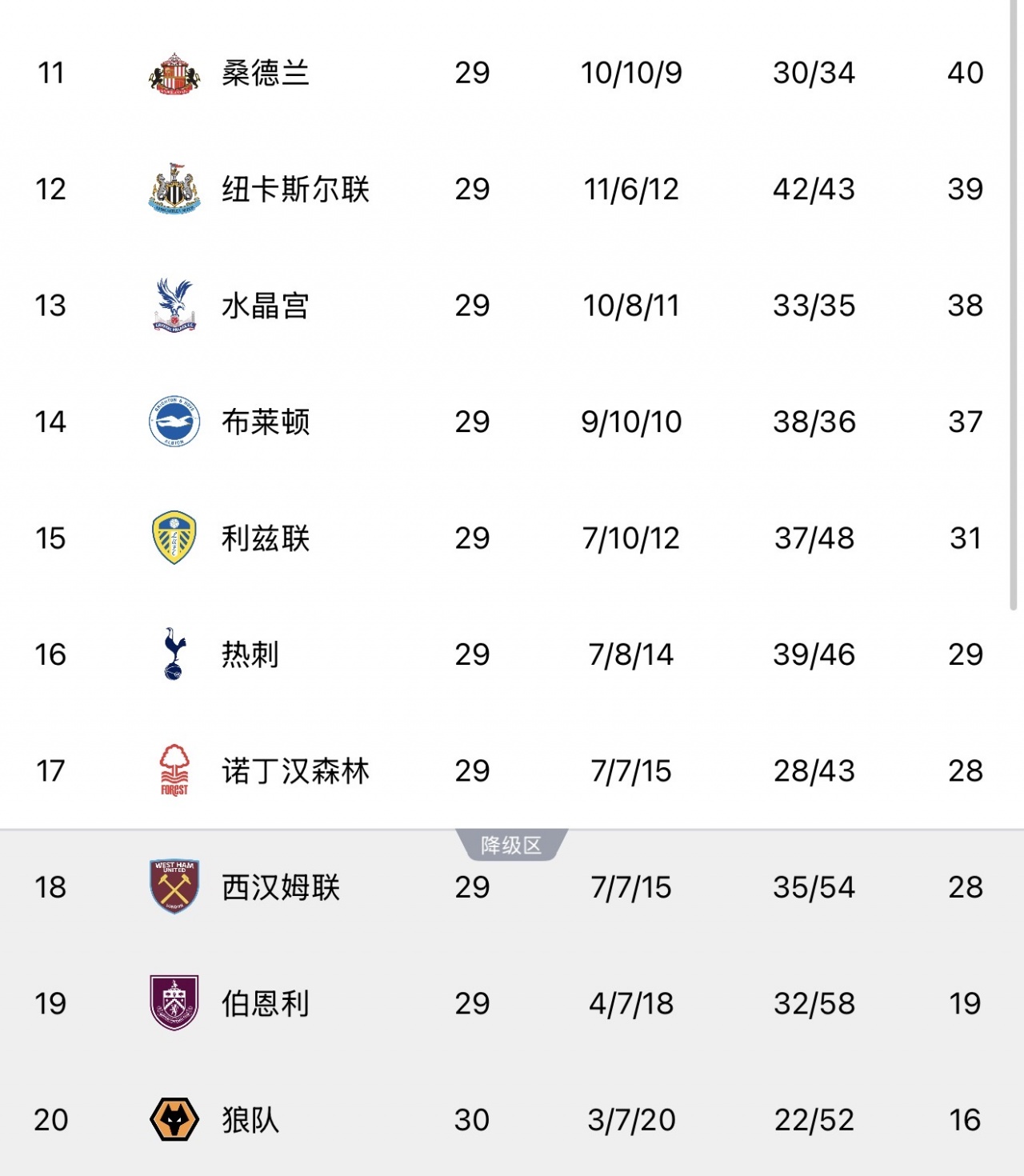 直播吧03月14日讯OPTA超算预测英超球队降级概率,目前排名倒数前二的狼队和伯恩利保级概率均不及1%,热刺的降级概率为18.11%。