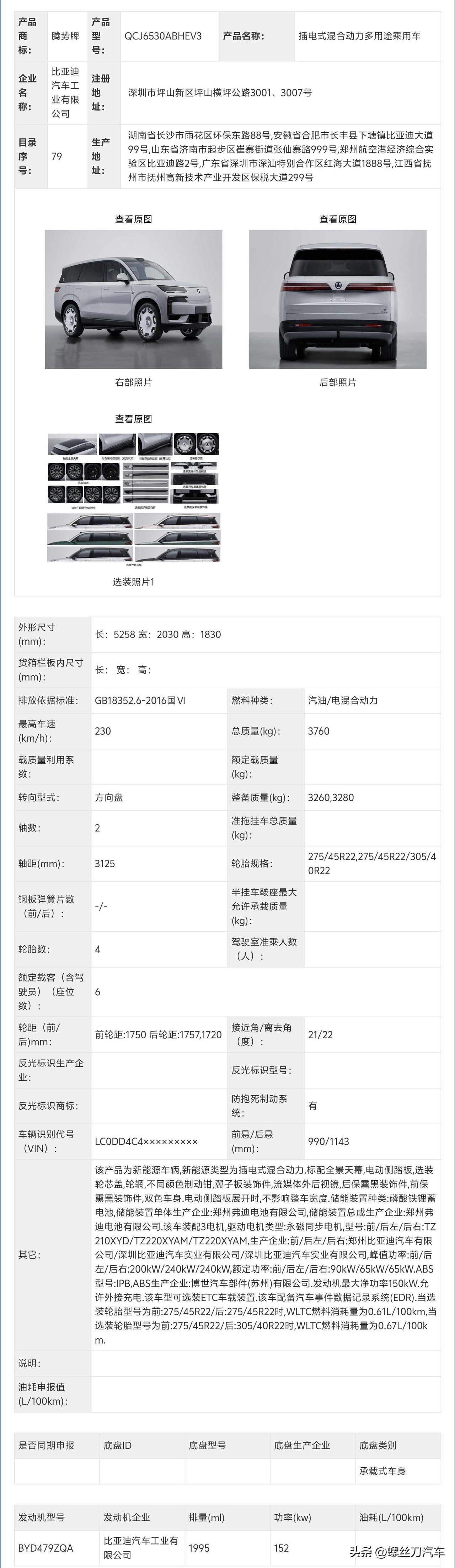 CLTC纯电续航420km、第二代刀片电池、闪充技术上车!新款腾势N9工信部申报图来了 日前,新款腾势N9亮相工信部公示,可以看到新车配备专属高端轮毂媲美迈巴赫、第二代刀片电池、闪充技术、CLTC纯电续航420km,最低荷电油耗6.9L/100km,可以说新款腾势N9把比亚迪开年的王炸技术全部上车了。 新款腾势N9搭载专属豪华设计套件,进一步强化了豪华气场,又在“安全之王”与“操控之王”的基础上更上一层楼,可以说已经是一款无短板的科技安全旗舰SUV,新车值得期待!