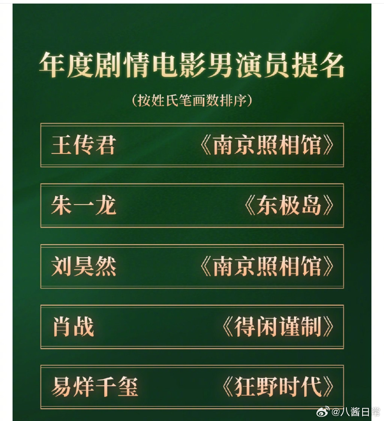 首届CMG中国电影盛典年度剧情电影男演员提名王传君《南京照相馆》朱一龙《东极岛》刘昊然《南京照相馆》肖战《得闲谨制》易烊千玺《狂野时代》