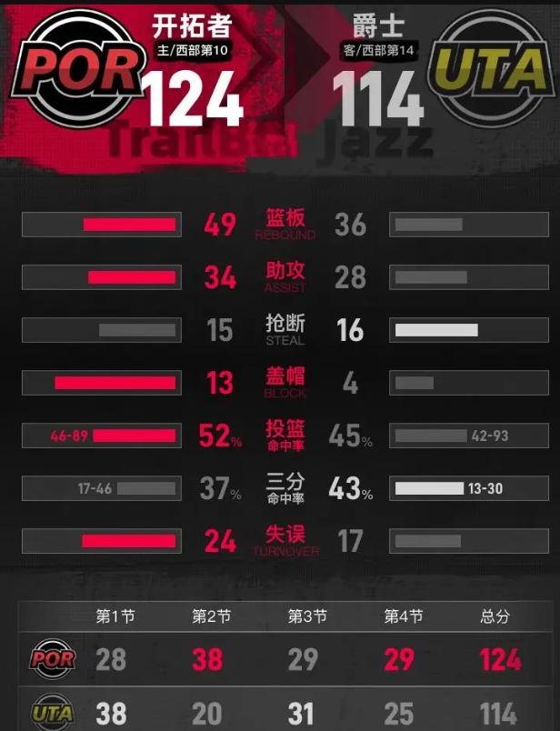 所有人都说开拓者完蛋了。18分分差,半场打完落后,球馆里那几千个穿红色球衣的,心里都在骂街。结果呢?朱·霍勒迪站在三分线外,手起刀落,第二节那个14-0,直接把爵士打懵了。谁敢告诉我,这叫"摆烂队"? 这就是老兵的恶趣味。朱哥35岁了,16投10中,25分7助攻,正负值+10。他每一个球都像是给对面年轻人上课——森萨博,你不是能投吗?31分,8个三分,手感烫得能点烟。可你数数爵士其他人的表情,第三节被追平那会儿,一个个跟丢了魂似的。篮球不是单挑,是五对五,朱哥笑着就把节奏捏死了。 克林根才是那个隐藏的杀招。21分15篮板,7个盖帽(数据有的说6个,取7个),正负值+20。这二年级的7尺长人,活生生把爵士的内线变成了禁飞区。想突破?他站在那儿就是一堵墙。篮板?单手抓下来跟摘苹果似的。赛后他走回更衣室,脚步都是飘的——这不是疲惫,是年轻人第一次尝到主宰比赛的滋味。 阿夫迪亚那句"在波特兰找到了家"听着矫情,但你看他17分6篮板8助攻的全面数据,每个助攻都喂得舒服。这支球队没有超巨,没有流量明星,甚至连杨瀚森都只能最后48秒登场,连汗都没出透。可他们有霍勒迪的冷静,有克林根的护框,有亨德森替补上来的25分。 爵士输得不冤。森萨博的31分像极了年轻时的比利拉德——光会得分赢不了球。当科利尔那9次助攻被开拓者切断,当科迪·威廉姆斯的19分变成零敲碎打,爵士就只剩一把钝刀。 终场哨响,124-114。这不是爆冷,这是规律。老兵不死,只是换种方式赢球。在这个推崇年轻天赋的联盟,35岁的朱哥和21岁的克林根,用最老派的方式——防守、篮板、分享球——告诉所有人:篮球终究是个团队游戏。那些赛前写好的"开拓者必败"的稿子,删了吧,脸疼。杨瀚森登场48秒克林根21+15 阿夫迪亚17分开拓者胜爵士
