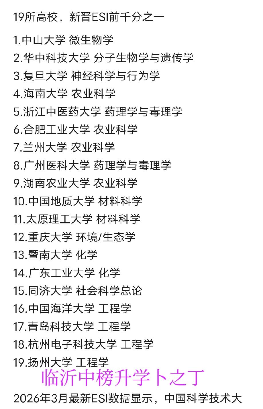 2026年,有19所高校新晋ESI前千分之一学科。其中中国海洋大学跟青岛科技大学的工程学入围,让山东的高校又多了一些含金量。大家都知道,青岛科技大学化工很不错,为B+学科。欢迎大家留言文明交流!