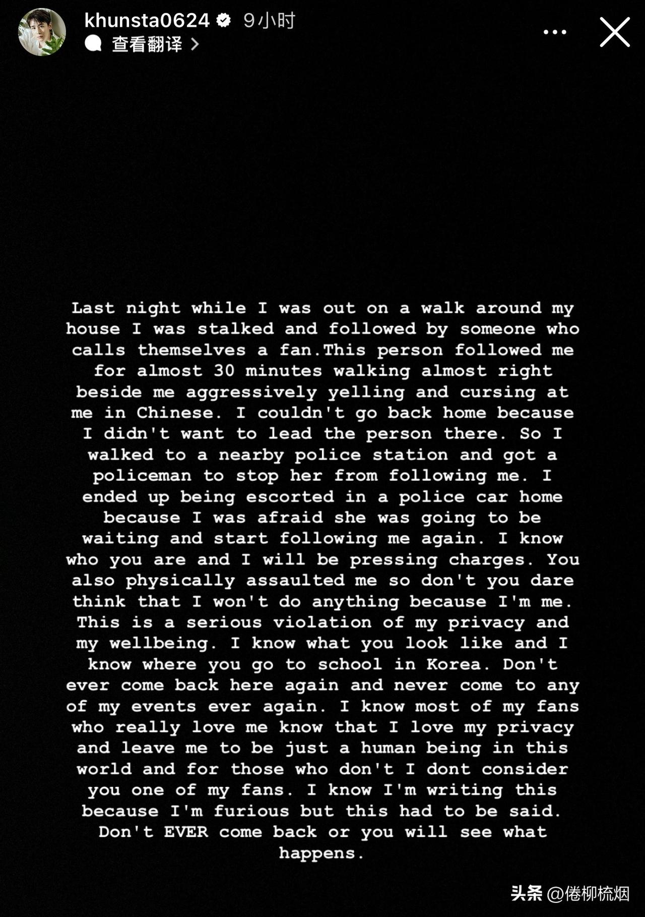 Nichkhun称遭私生饭跟踪骚扰。。 2PM尼坤Nichkhun发表快拍称,在家附近散步时,被一个自称是粉丝的人跟踪了将近30分钟,并用中文辱骂自己。最后不得不求助警察帮忙阻止,并送自己回家。。