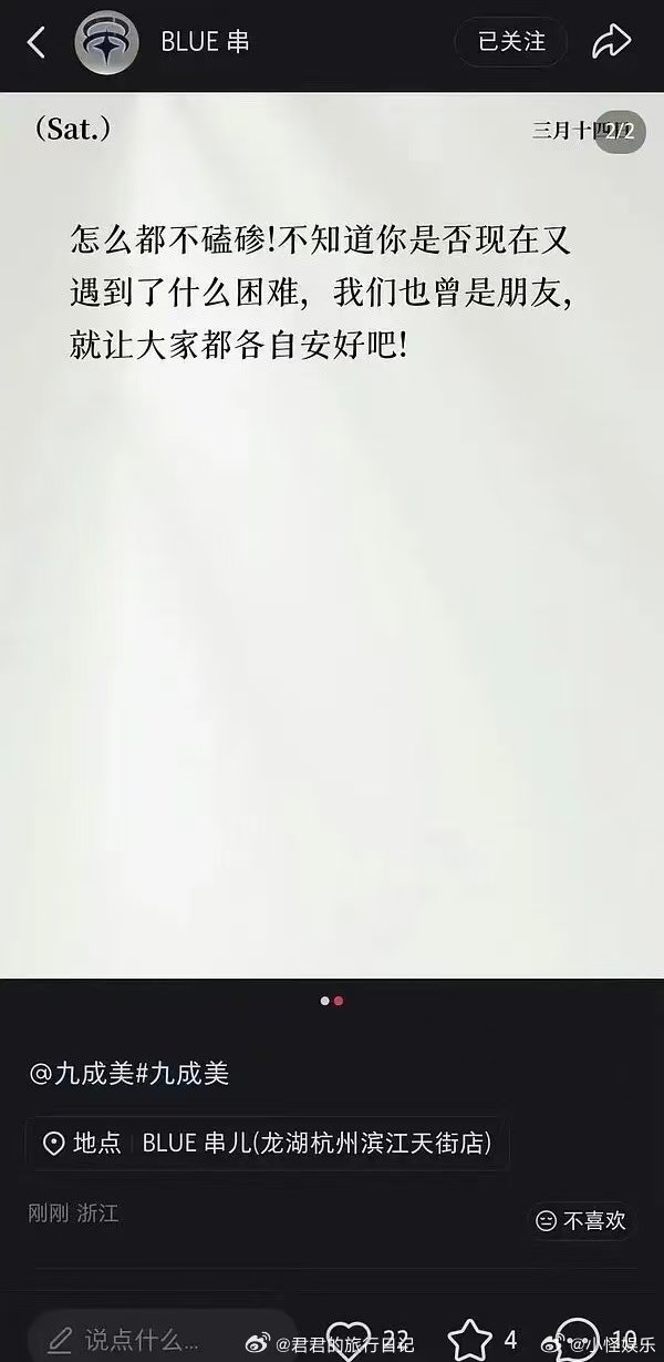 田栩宁的好兄弟blue串发长文力挺他田栩宁好朋友blue串发文劝九成美 blue串力挺田栩宁的同时,也没忘了劝九成美:“人家帮过你,就别总冷冰冰的。”还特意提了雷子收留他的事,显然是希望九成美能多些感恩之心。