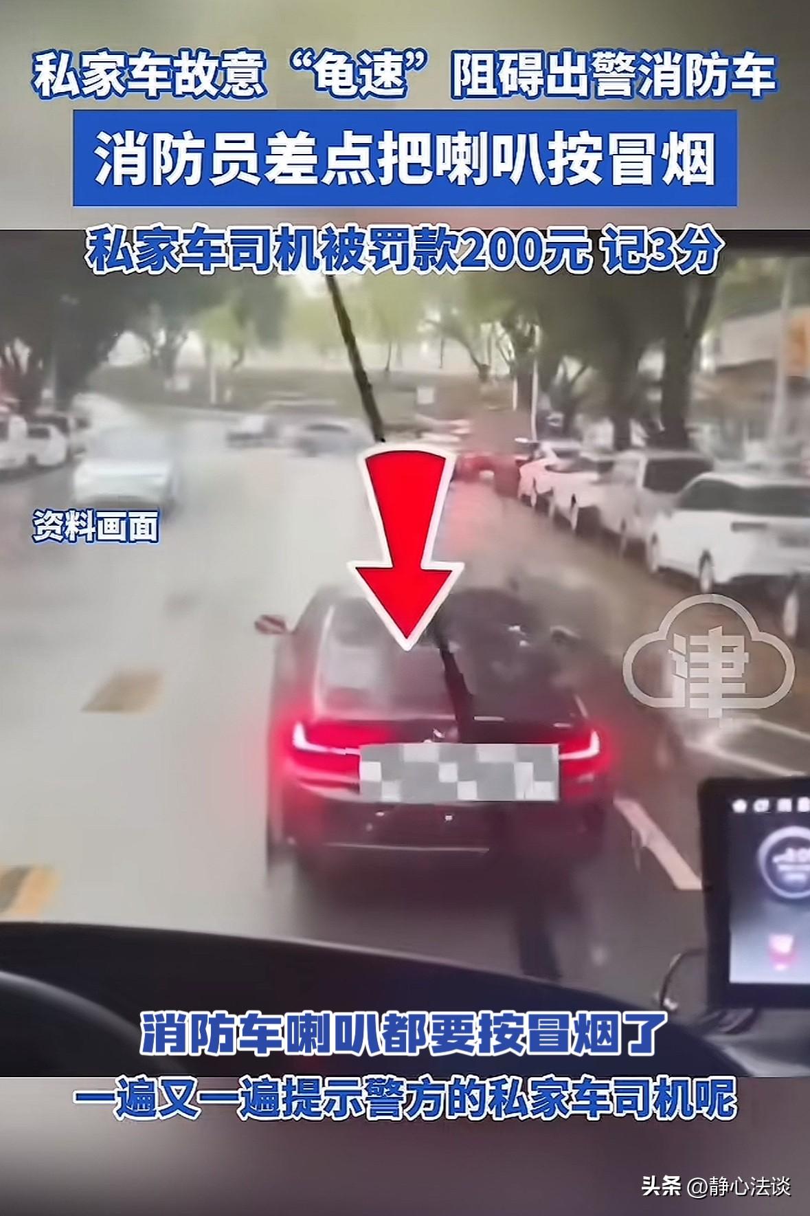 心都坏透了!广东梅州,一辆私家车故意低速行驶,阻碍后面的出警消防车,消防车多次鸣笛提示,私家车还是拒不避让,连靠边让行的意思都没有,事后这名司机被处罚款200元,记3分。网友:拿别人生命当儿戏,罚的太轻了! 事发当天,一辆消防车接到报警,火急火燎的奔赴现场。 却没想到,竟被一辆私家车极力阻拦,凭一己之力,堵住了别人的救命路。 当时路上车流量并不大,视线也十分开阔,正常情况下,沿途车辆看消防车都会第一时间靠边避让。 可就在消防车准备超车的路段,一辆私家车却像蜗牛一样,稳稳占着最左侧的车道。 以慢悠悠的龟速向前行驶,速度慢到甚至比路边的非机动车还慢。 消防车立刻拉响了最高分贝的警笛,一遍又一遍的按喇叭。 可前方的私家车司机,仿佛完全听不见一样,依旧保持着不变的车速。 既不靠边,也不超车,就这么横在消防车正前方,堵着去路。 车里的消防员急得手心冒汗,一边盯着前方的私家车,一边看着时间,毕竟火场的情况容不得半点耽搁。 他们隔着车窗,用力朝私家车司机挥手示意,用眼神、用动作拼命提醒。 可无论他们怎么做,司机车司机都视而不见。 就这样,消防车在主干道上被迫龟速跟行,原本几分钟就能通过的路段,硬生生被拖了许久。 周围的路人看到这一幕,也都气不打一处来,有人忍不住指着私家车议论,有人拿出手机记录。 大家都想不通,明明有充足的空间让行,明明听得到警笛,怎么会有人如此冷漠。 这根本不是在开车,这是在拿别人的生命当儿戏。 更可气的是,事后,那辆私家车的司机被依法处罚200元,记3分。 很多人觉得这处罚太轻了,根本起不到作用,就该重罚,让他长记性。 有人说,这种司机就是缺少德,无视规定,根本不配开车,就该吊销驾照,再送他一副银手镯! 我们总说救人一命,胜造七级浮屠,而给紧急车辆让行,就是最直接、最简单的行善。 一个小小的靠边动作,一次主动的避让,可能就能为救援争取到宝贵的时间,可能就能挽救一条鲜活的生命,一个幸福的家庭。 可偏偏有人,抱着侥幸心理,觉得多我一个不多,少我一个不少,觉得什么事都与自己无关。 却忘了,什么事都有个万一,今天你堵了别人的路,明天当你需要帮助时,可能就会面临无路可走的困境。 《道路交通安全法》第53条:警车、消防车、救护车、工程救险车执行紧急任务时,可使用警报器、标志灯具,在确保安全的前提下,不受行驶路线、方向、速度和信号灯限制,其他车辆和行人应当让行。 消防车出警属于执行紧急救援任务,鸣笛就是明确的让行提示。 涉事私家车有条件让行却故意龟速阻挡,就要为自己的行为付出代价。 至于对司机之所以没有拘留,是因为暂未达到情节严重的认定标准。 通常情节严重指的是多次阻碍,造成救援严重延误并产生重大损失等情况才可以。 对此,你怎么看这件事情! @静心法谈 学法辨是非,慬法不吃亏。