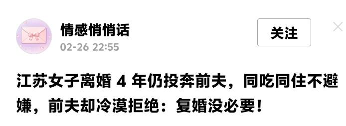 江苏女子离婚四年仍与前夫同床共枕:一场“免费保姆”式的复婚拉锯战,戳破多少中年女性的体面伪装 当离婚证变成一张废纸,同个屋檐下的生活却照旧进行,这究竟是破镜重圆的温情,还是一方精心算计的戏码?江苏这位34岁女子的选择,撕开了多少“独立女性”光环下的狼狈与不甘。 她曾以为离开婚姻就能海阔天空,却在外兜转两年、花光积蓄后,发现世界并未对她温柔相待。三个恋爱对象无果而终,现实给了她一记响亮的耳光——原来,不是所有三十岁的离婚女性,都能轻易重启人生。 以“照顾女儿”为名,她顺理成章回归前夫的家。同吃同住,甚至同床共枕,却唯独少了那张结婚证的束缚。她开始在社交平台分享日常,镜头里勤快做家务、温柔扎辫子的形象,与从前那个抱怨丈夫不做家务的她判若两人。 前夫的沉默与配合,更像一场心照不宣的交易。有人暖被窝,有人理家务,生活开销从每月过万骤降至五千,这笔账谁算不清?直到女子试探性提出复婚,男人那句冰冷的“没必要”,才彻底揭穿这场同居游戏的本质——你需要归宿,他需要便利,唯独爱情早已散场。 网友的嘲讽如潮水涌来:“离了婚还睡一起,这婚离了个寂寞?”“不过是外面没人要,回头找接盘侠。”但骂声背后,何尝不是万千中年离婚女性的集体焦虑?当青春红利消退,经济能力有限,社会对单身女性的隐形歧视,往往让她们陷入“无处可去”的窘境。 这场离婚不离家的闹剧,看似荒唐,实则写满现实的算计。女子视频中那句“为女儿营造完整童年”,不过是为自己的依赖披上母爱的外衣。而前夫的拒绝复婚,更是清醒划清界限:你可以暂时停留,但别想用婚姻再次捆绑我。 婚姻的本质从来不是浪漫童话,而是供需关系的平衡。当她停止索取,开始付出;当他享受便利,却不愿负责,这场拉锯战里没有赢家。或许真正该觉醒的,是那些幻想“随时能回头”的人——离婚从来不是赌气,而是认清彼此再也无法同舟共济的决断。 倘若感情已成废墟,与其在废墟上搭建临时帐篷,不如彻底离开重建家园。女人的归宿从来不是某个男人,而是那个离了谁都能站稳的自己。这场江苏女子的同居日记,该醒的不只是她,还有所有在婚姻围城内外徘徊的灵魂。 (来源:情感悄悄话) 离婚不离家 中年女性困境