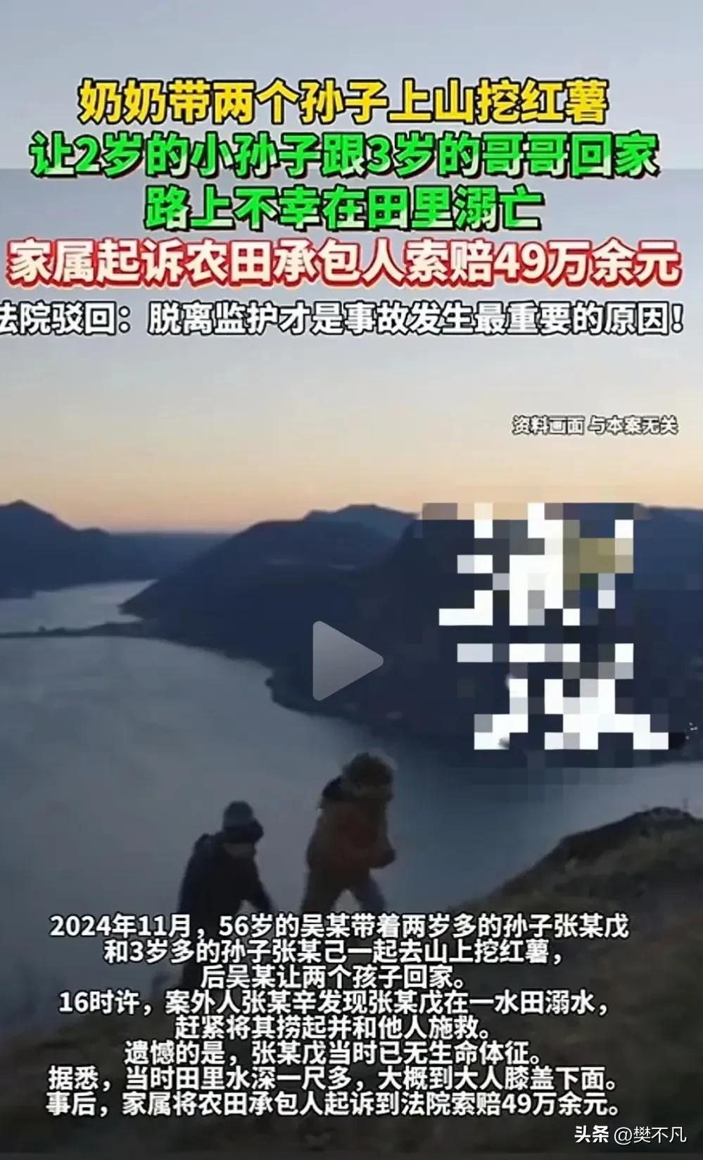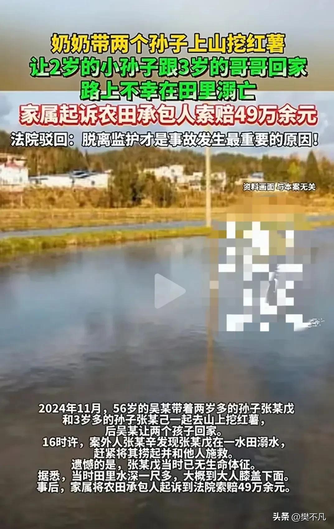 河南某地,56岁的吴某带着两个小孙子去地里挖红薯。 大的3岁多,小的2岁多。 俩孩子在田埂上追着玩,奶奶一边挖红薯一边吆喝:别跑太快,小心摔着。 孩子们不听,继续疯跑。 挖得差不多了,奶奶做了一个让她后悔终生的决定。 她让3岁多的哥哥领着2岁多的弟弟先回家,自己再挖一会儿就回。 哥哥拉着弟弟,消失在田埂尽头。 奶奶怎么也想不到,这是她见小孙子的最后一面。 从地里回家的路不远,但要经过一片片的田地。 3岁的哥哥在前面走,2岁的弟弟在后面跟着。 走到一片有积水的田边时,弟弟脚下一滑,掉进了泥水里。 哥哥没发现,还在往前走。 走了一段,回头一看,弟弟不见了。 再一看,弟弟已经在泥水里扑腾。 3岁的孩子,能有多大劲儿,他伸手去拉,根本拉不动。 只能眼睁睁看着弟弟慢慢不动了,漂浮在水面上。 哥哥吓得哇哇大哭。 哭声引来了路过的村民,赶紧跑过来把孩子抱出来。 但已经晚了。 孩子没了呼吸。 奶奶吴某听到消息,扔下红薯疯跑过来。 看到小孙子冰凉的身体,她当场崩溃: “是我害了他!我不该让他们自己回去!” 但再多的眼泪,也换不回孩子的命。 家人赶到后,抱在一起哭成一团。 这事到这儿,已经够惨了。 可接下来发生的事,让人不知道该说什么。 这家人没有反思自己的监护责任,反而把矛头对准了那片水田的承包人。 他们要把田主张某告上法庭,索赔49万。 这片水田,之前一直荒着,长满杂草,还堆了垃圾。 承包人张某接手后,简单清理了一下,把杂草和垃圾处理了。 但因为地势低洼,一下雨就容易积水。最深的地方也就一尺多,成年人走过去啥事没有。 可对一个2岁的孩子来说,这浅浅的一尺水,就要了命。 家属认为:你既然清了草,就该负责。积水有安全隐患,你为什么不设警示牌? 于是起诉,索赔49万。 法院审理后,没有支持家属的诉求。 《民法典》第二十六条说得清楚:父母对未成年子女负有抚养、教育和保护的义务。 第三十四条也规定:监护人要保护被监护人的人身权利。 一个2岁多的孩子,最该负责的是谁? 是监护人。 让一个3岁的孩子带着另一个2岁的孩子独自回家,这个决定本身就是重大过失。 监护职责的缺位,是这起悲剧的根本原因。 至于承包人,他只是清理了荒地,没有改造成鱼塘,也没有故意制造危险。一尺深的积水,对正常人不构成威胁,他没有义务在农田周围设立警示牌。 法院判决:责任在监护人,承包人无需赔偿。 家属不服,上诉,二审维持原判。 这事最让人唏嘘的是不是悲剧的发生,而是发生后的反应。 一个2岁的孩子没了,最痛的是家人。 但如果真的痛,第一反应应该是反思自己的疏忽,而不是到处找人赔钱。 奶奶让3岁的哥哥带2岁的弟弟回家——这个决定有多危险,任何一个有常识的人都该知道。 3岁的孩子,自己都照顾不好,怎么能照顾另一个更小的? 可当时没有人觉得有问题。 直到悲剧发生,才开始找“责任人”。 承包人清理了荒地,就成了责任人? 水田有积水,就成了安全隐患? 那农村的地是不是都得围起来、贴满警示牌? 真正的责任人,是那个让孩子独自面对危险的人。 49万,买不回一条命。 但至少,可以让活着的人明白:监护责任,重于泰山。别等到出事,才想起自己该做什么。 你怎么看这个判决?评论区聊聊。