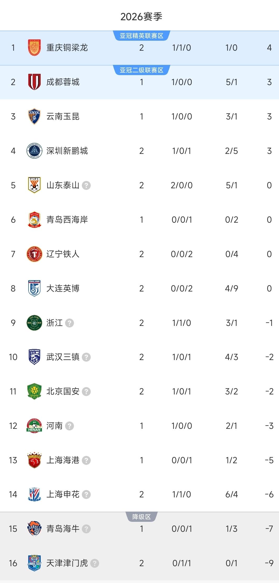 中超最新积分榜出炉! 津门虎0-1被绝杀,-9分继续垫底! 铜梁龙1-0创历史,迎首胜! 北京时间3月14日,中超联赛第二轮的角逐。 ①浙江1-1上海申花。 开局仅10分钟特谢拉弧顶位置的一脚凌空抽射入网,申花反客为主奠定基调。随即两队陷入缠斗,互有攻守,主裁部分吹罚时引起争议。下半场第66分钟浙江把握定位球机会,禁区乱战,王钰栋破门扳平。剩余时间再度拉锯,最终1比1握手言和。 ②山东泰山2-1北京国安。 比赛上半场身体对抗激烈,创造的机会寥寥,暂时交白卷。下半场回来泰山率先破局,克雷桑连线谢文能进球,第49分钟打破平衡。落后的国安奋起猛追,苦苦坚持,第86分钟张玉宁近距离包抄得手扳平,结果没高兴太长时间,第88分钟克雷桑头球绝杀,山东泰山2比1告捷,守住主场,收获两连胜。 ③重庆铜梁龙1-0辽宁铁人。 比赛前45分钟的对决平平无奇,甚至略显枯燥,没有意外的0-0。直到下半场转折点出现,第55分钟铁人外援瓦吉奇铲球犯规领到红牌,更糟糕是铜梁龙把握这次任意球机会,肯帕努主罚直接入网,此后时间11打10守住胜利,局面优势不错,只是把握能力有待提升,最终他们创造队史纪录,迎来中超首胜。 ④深圳新鹏城1-0天津津门虎。 两队长时间拉锯,直到第84分钟门将齐雨熙出击失误送礼,韦斯利近距离抢射空门一锤定音,新鹏城迎来赛季第1胜。津门虎又一场低迷表现,组织能力差劲,几乎没有进攻可言,前两轮仅拿1分且一球未进,因为扣分缘故,他们目前-9分垫底,前景不容乐观。