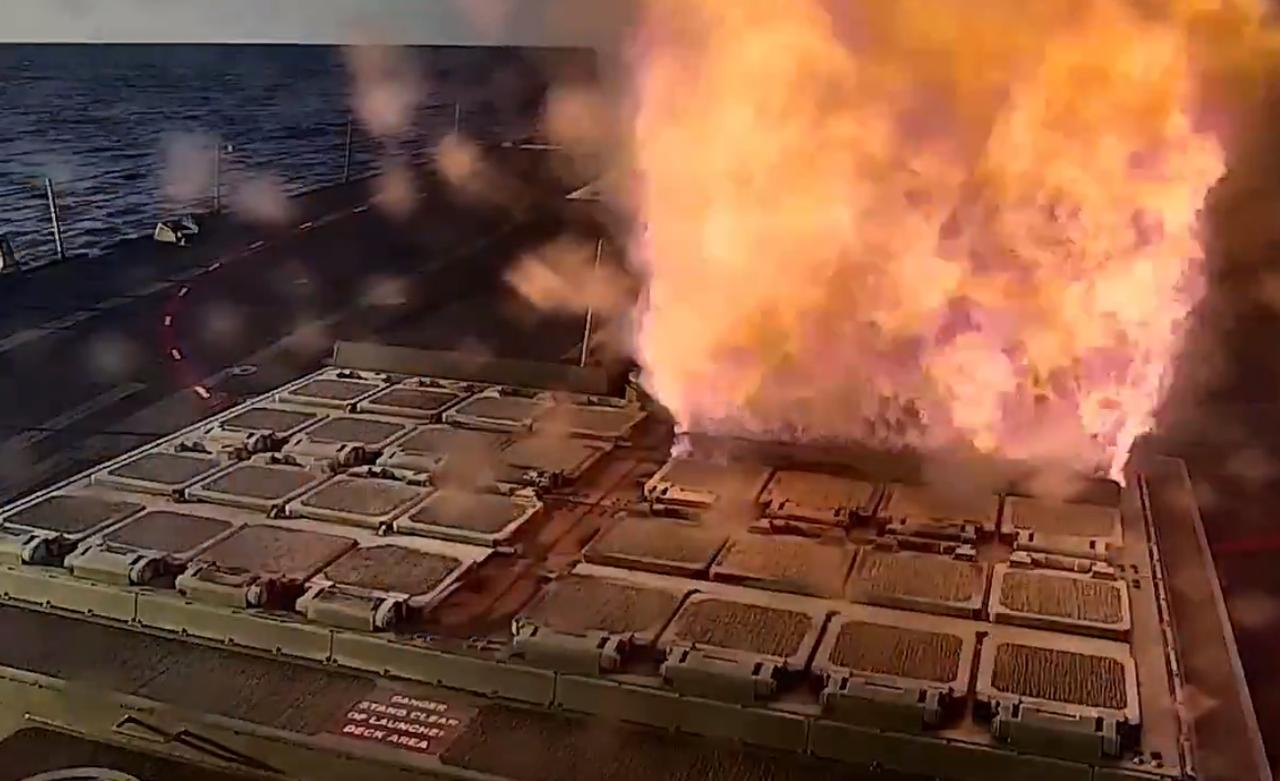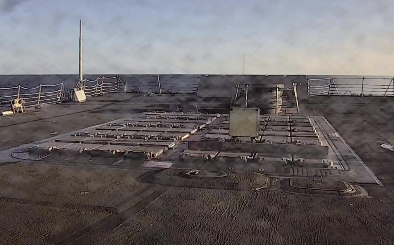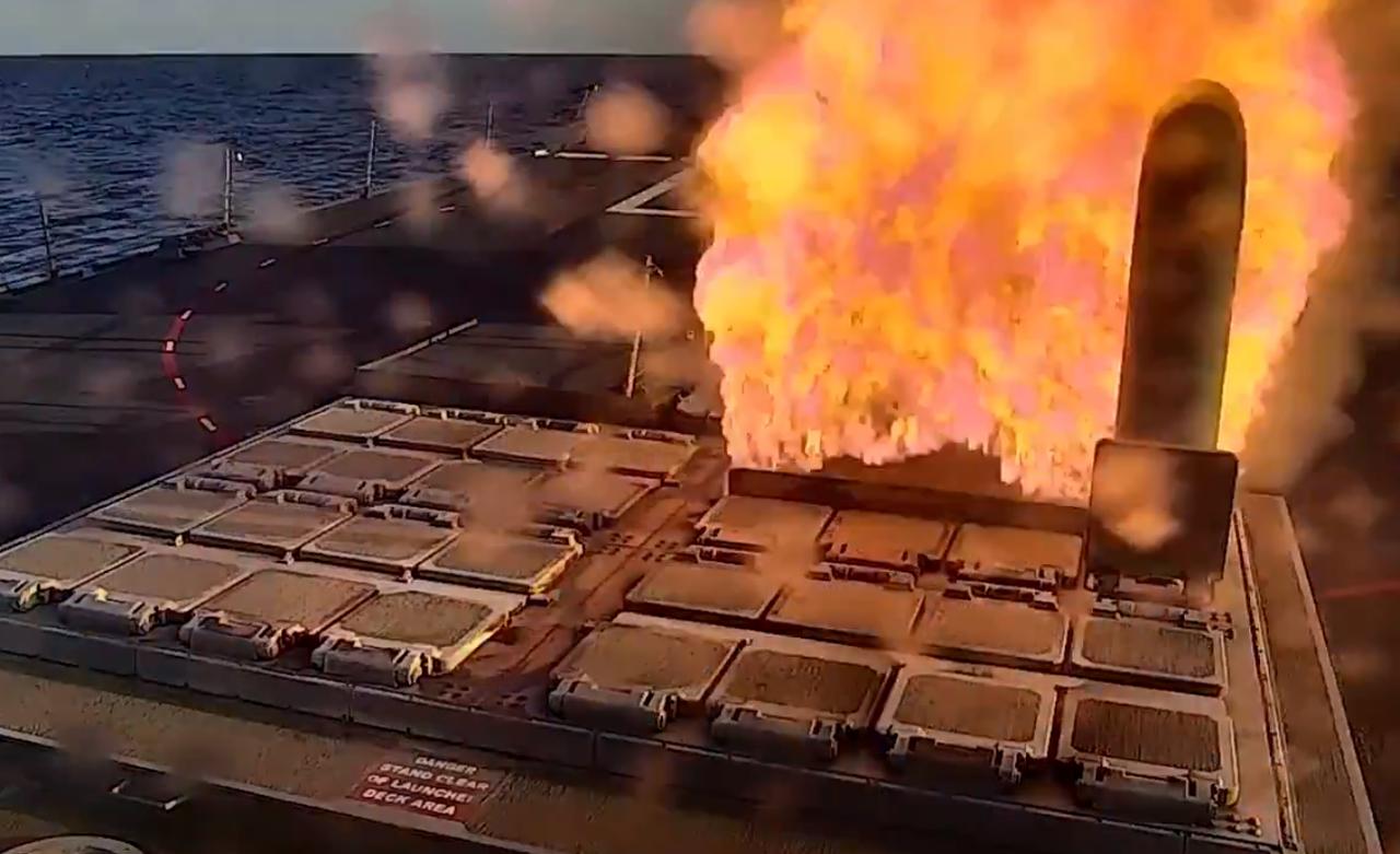 周二,美国海军驱逐舰约翰·芬号(DDG 113)向伊朗发射了 13 枚战斧巡航导弹,这是舰上拍摄的画面。