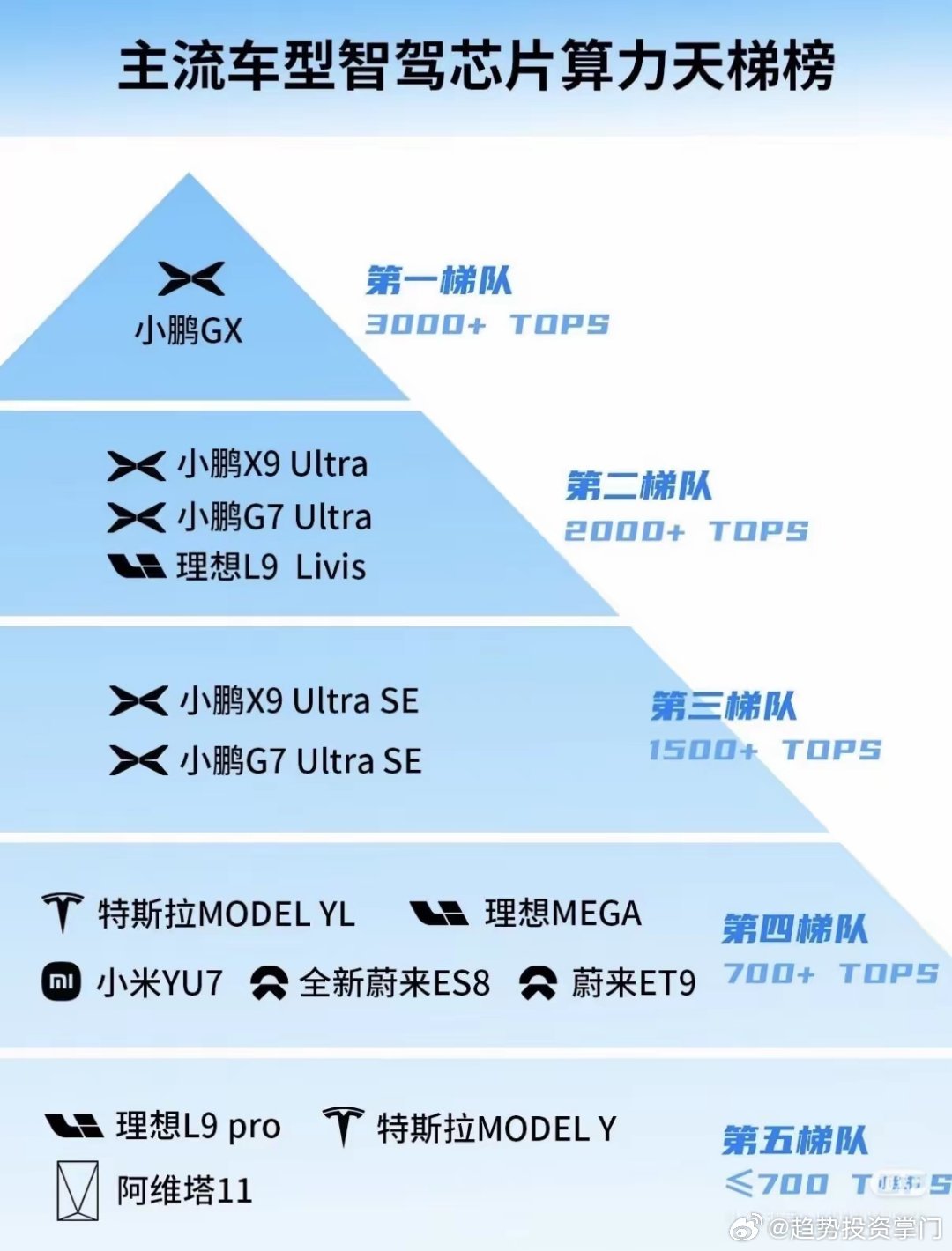 智驾芯片算力天梯榜|精简原创版智驾算力格局刷新!小鹏GX3000+TOPS断层领跑,特斯拉跌至第四梯队。算力梯队速览- 1梯队(3000+):小鹏GX,独一档天花板- 2梯队(2000+):小鹏X9/G7 Ultra、理想L9 Livis- 3梯队(1500+):小鹏X9/G7 Ultra SE- 4梯队(700+):特斯拉YL、理想MEGA、小米YU7、蔚来ES8/ET9- 5梯队(≤700):理想L9 Pro、特斯拉Y、阿维塔11核心看点- 小鹏包揽前三梯队,算力形成代差优势- 特斯拉算力大幅落后,靠算法维持体验- 新势力集中在700–2000TOPS,暂难撼动小鹏