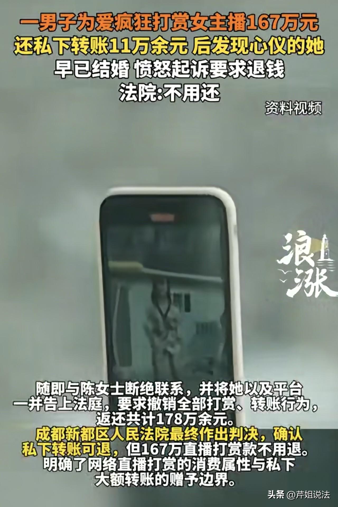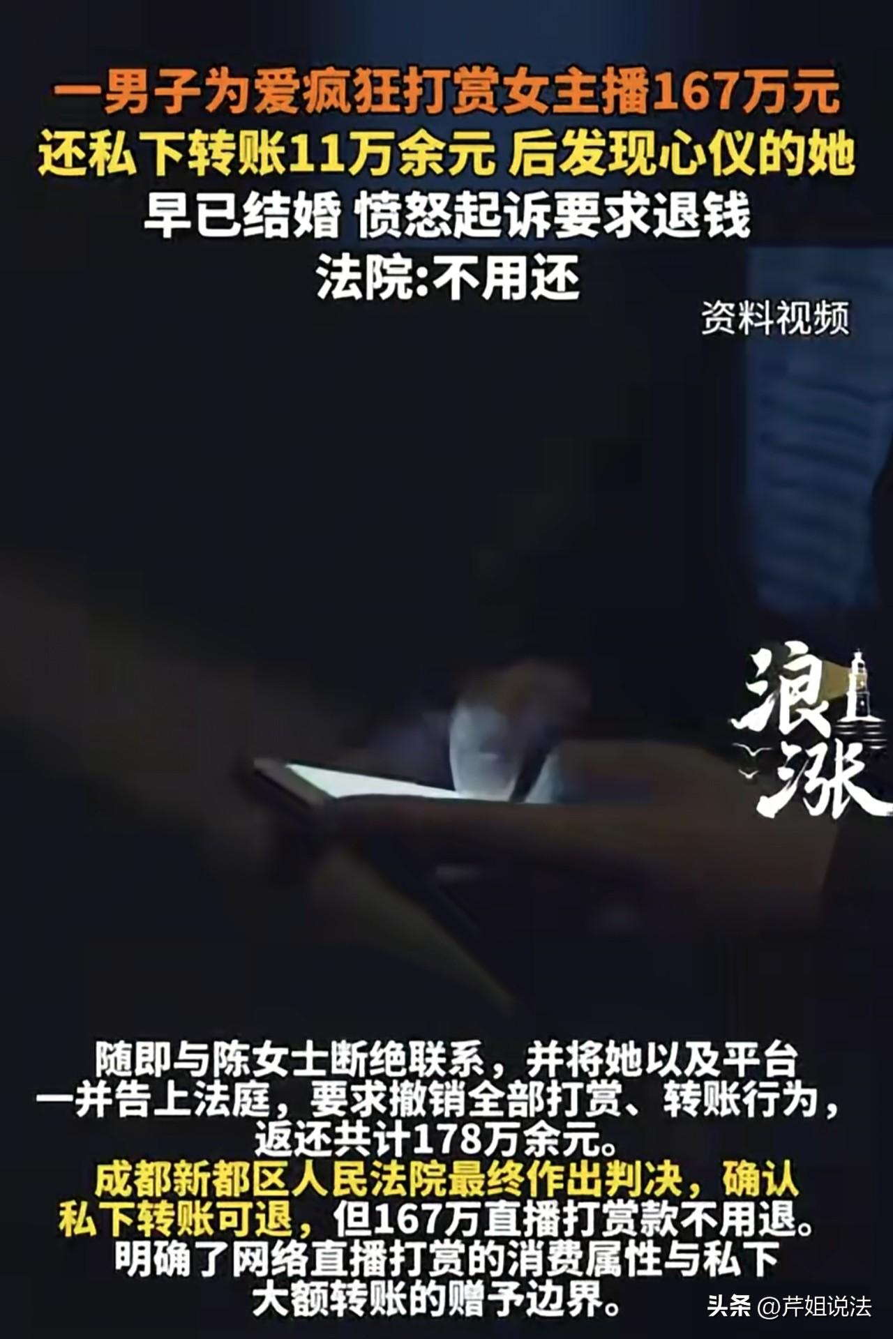 成都,瞿某每天最重要的事情就是去给自己心仪的女主播打赏,仅半年时间就花了167万元,他以为他们是男女朋友关系,他是在支持自己女朋友的事业,他觉得苦了自己,也不能苦了她,钱不够,他甚至借钱来打赏,只为了博美人一笑。 可现实却给了他当头一棒,一次意外,瞿某发现她早就已经结婚了! 瞿某顿时傻眼了,她当自己是傻子吗?自己可是足足给她砸了百来万,气愤之下,瞿某将她起诉了。 2024年10月的一天,无聊刷手机的瞿某,随便点进了陈女士的直播间。 没到一会,瞿某的好感度就被陈女士刷满了,她长得漂亮,在特效的加持下,瞿某觉得她就跟天仙似的,讲起话来也温温柔柔。 于是瞿某大手一挥就开始给陈女士刷礼物,因为礼物特效,陈女士很快就注意到了他,她掐着一把似水的嗓音向瞿某感谢,他们打得火热。 工作之余,陈女士出于维护粉丝的目的,主动添加了瞿某的好友,聊天的内容也逐渐变得暧昧,而每次只要陈女士开播,瞿某就会去捧场,化身大哥守护她。 认识了一小段时间后,瞿某就开始向陈女士表白自己的心意,他恨不得把自己的心都捧出来给她看,他多次向陈女士说类似你就是我的全部,只有你能做我的女朋友这样的情话。 陈女士看到这样暧昧的话,便顺着叫他宝宝,说一些自己想他了这样暧昧的话,好像是和他谈了,但又没有明确地答应和拒绝。 可看到这些,瞿某却是上头了,他认定自己和陈女士已经是男女朋友的关系了,自己应该给陈女士更好地生活,于是他刷礼物刷得更疯狂了。 私下也开始频繁向陈女士转账,他不但给陈女士转账,有一些转账还是给陈女士的母亲的。他觉得自己这个准女婿还是应该好好讨好一下丈母娘的。 可他只是一个普通人,他的工资完全不足以支持他大刷特刷和在私下里的转账。 于是,他开始借钱,借钱给陈女士砸礼物,砸钱。 为了向陈女士表明自己对她的爱意,瞿某把这件事告诉了陈女士,他说自己每天花50元就够了,借来的钱,工资下来了,也可以慢慢还掉的,他让陈女士不要担心。 陈女士被瞿某的疯狂吓到了,她多次劝说瞿某不要再因为她去借钱了,可瞿某却以为陈女士是心疼他了,他也不想在自己心爱的女人面前丢面子。 于是他逞强说自己撑一撑就过去的,没事的,自己是男人,再怎么也不能苦了自己的女人,自己以后还会给她刷的,会对她越来越好的。 25年3月初时,瞿某或许觉得他和陈女士已经相处了半年有余,有些事也应该提上日程了,于是给陈女士的转账更加大方起来。 每次的转账金额都上万,礼物也刷得更加疯狂,仅仅半年的时间,瞿某就给陈女士花了167万元,而其中他贷的款就有126万元。 因为他们是线下见过面的,所以瞿某一直觉得自己和陈女士就是恋爱关系,他们离结婚也不远了。 直到一次意外,瞿某发现陈女士竟然在19年就已经结婚了。 瞿某傻掉了,那自己这半年是在干什么?自己这是被骗了?自己不仅没谈上,还背上了高达126万元的钱? 瞿某气愤不已,于是他把陈女士告了,想要回他的178万元,他觉得如果不是觉得陈女士会和他结婚,他压根不会花下这么多的冤枉钱。 陈女士眼见自己被告了,也不装,她摊牌了,她说自己是已婚,可也从来没有说过自己是未婚啊。 她说自己从来就没有答应过瞿某,她们之间就是普通的朋友,她对他说的那些话就是用来维护粉丝的话,她对其他的粉丝也是这样说的。 她还指出,在这半年里,瞿某打赏的也不仅仅就她一个,他也和别的女人聊天了,也向别的女人转账了。 可见瞿某其实心底里也没有把自己当成是真正的女朋友,自己和他那些其他女主播也没什么多大的区别。 最终,陈女士需要退回瞿某私下转账11万元多,而瞿某打赏的167万元不用返还。 这是为什么呢? 《民法典》第一百五十七条规定民事法律行为无效、被撤销或者确定不发生效力后,行为人因该行为取得的财产,应当予以返还;不能返还或者没有必要返还的,应当折价补偿。有过错的一方应当赔偿对方由此所受到的损失;各方都有过错的,应当各自承担相应的责任。法律另有规定的,依照其规定。 瞿某私下的转账是以为自己和陈女士是女朋友才转的,而陈女士19年就结婚了,面对瞿某的追求,她只是说一些似是而非的话,一直在和瞿某暧昧地聊天,有诱导瞿某给她赚钱的意味。 陈女士的这个行为是违背公序良俗的,因此陈女士私下收到的11万元是无效的,应该返还给瞿某。 《民法典》第十八条规定,成年人为完全民事行为能力人,可以独立实施民事法律行为。 瞿某已经是成年了,他应该要为自己的行为负责,他打赏这个行为应该由他自己负责。 瞿某打赏的目的是从陈女士那里获得心理上的满足,陈女士积极和瞿某互动,感谢瞿某。 就等于是瞿某买了一件商品,并且已经获得他应该有的体验。 这些体验瞿某已经享受过了,他没有权利再要求退回他花的167万元。 你觉得瞿某以后还会不会情绪上头,又刷出巨额的打赏? 来源:红星新闻,浪张新闻