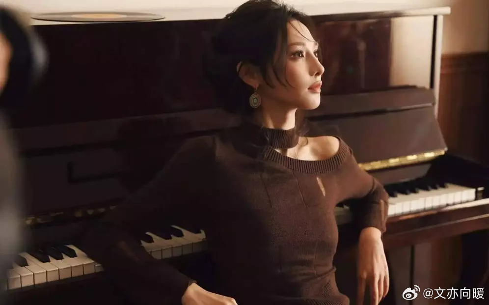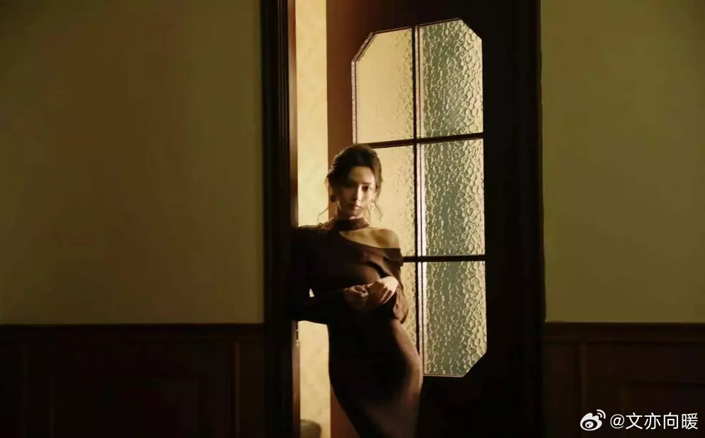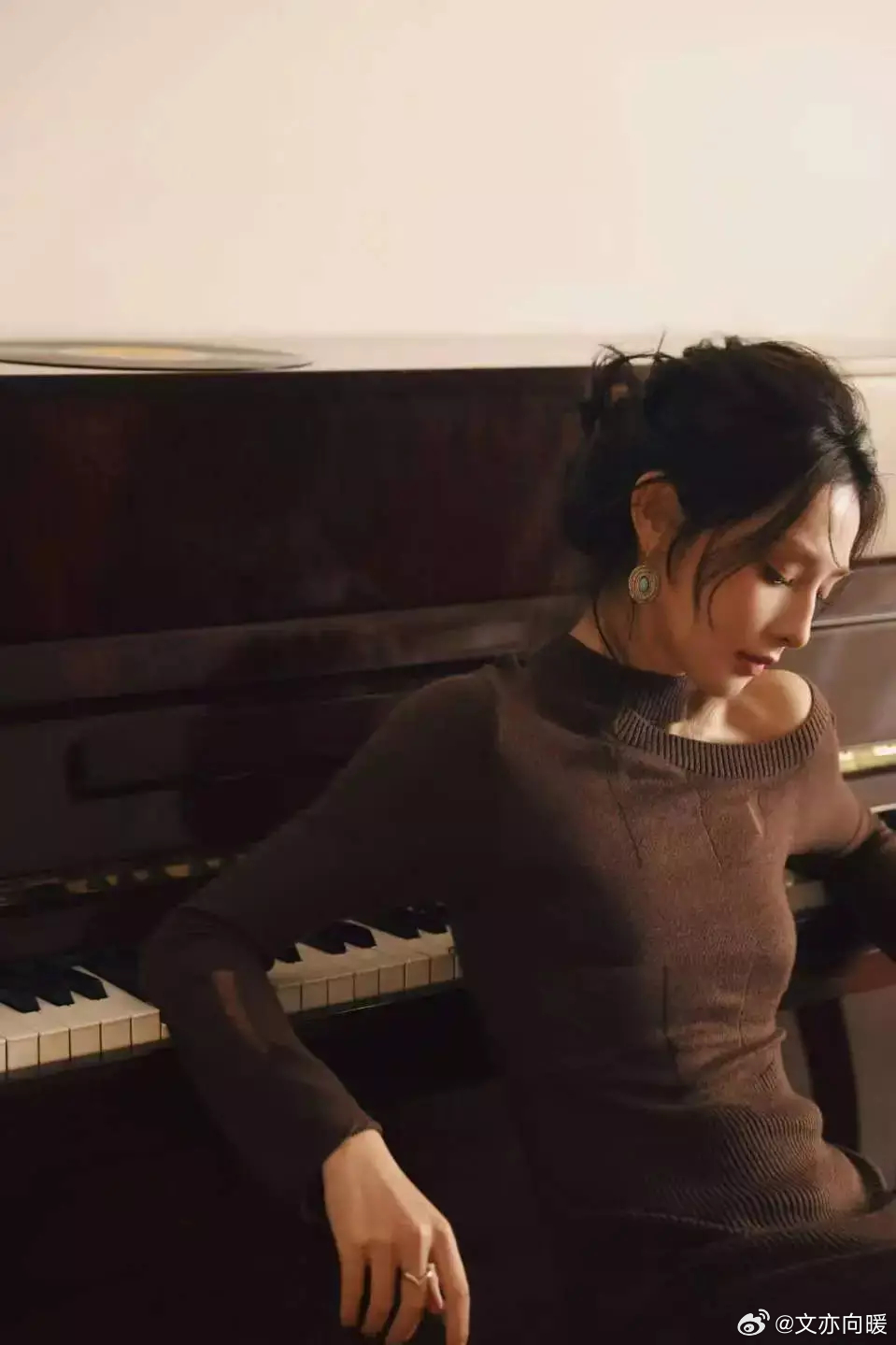 彭小苒穿咖色露肩针织裙,在暖光房间里尽显慵懒优雅。