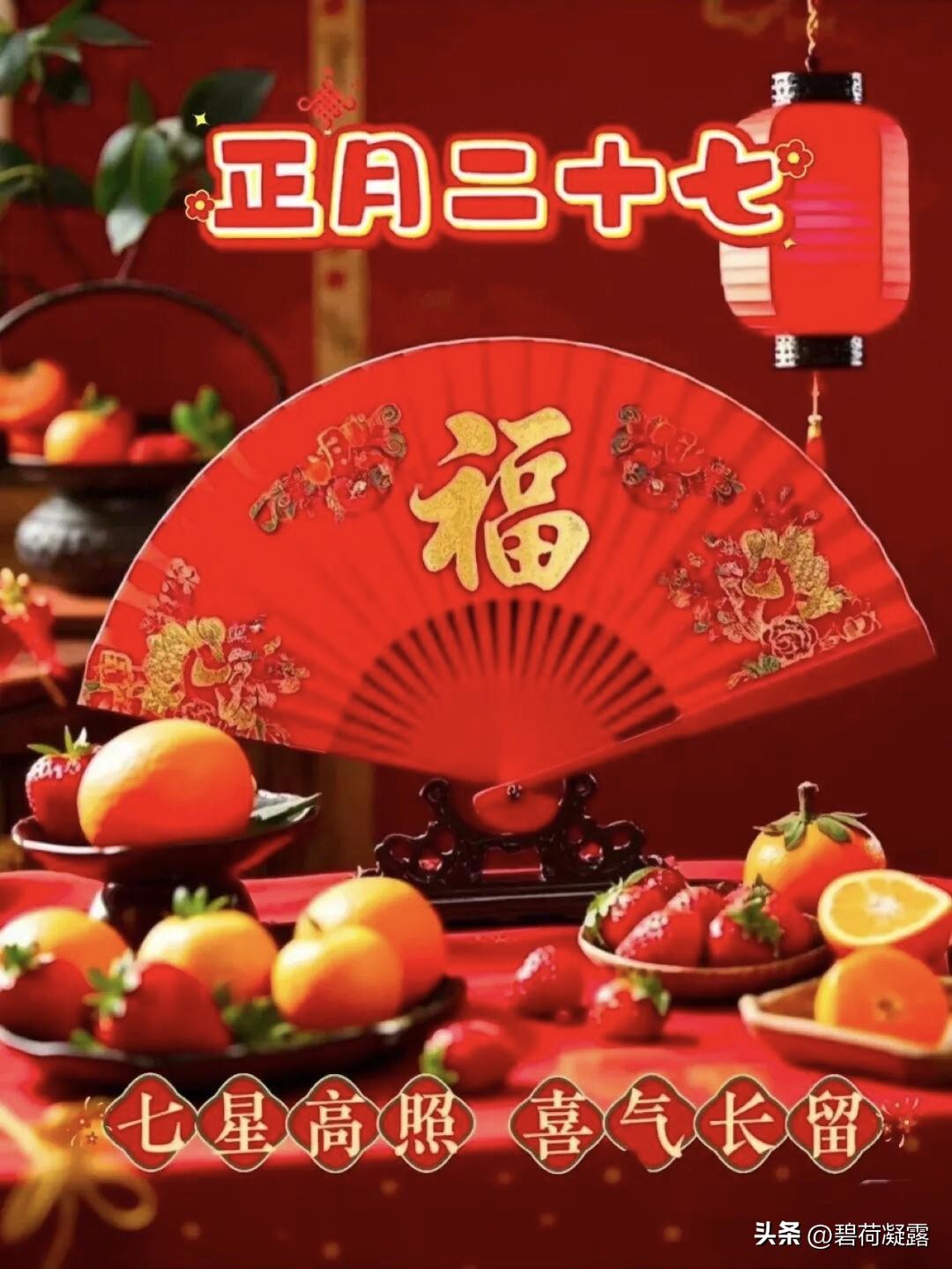 今日正月二十七,祝您七星高照,八方来财,久久安康,万事胜意,祝您生活顺风顺水,钱