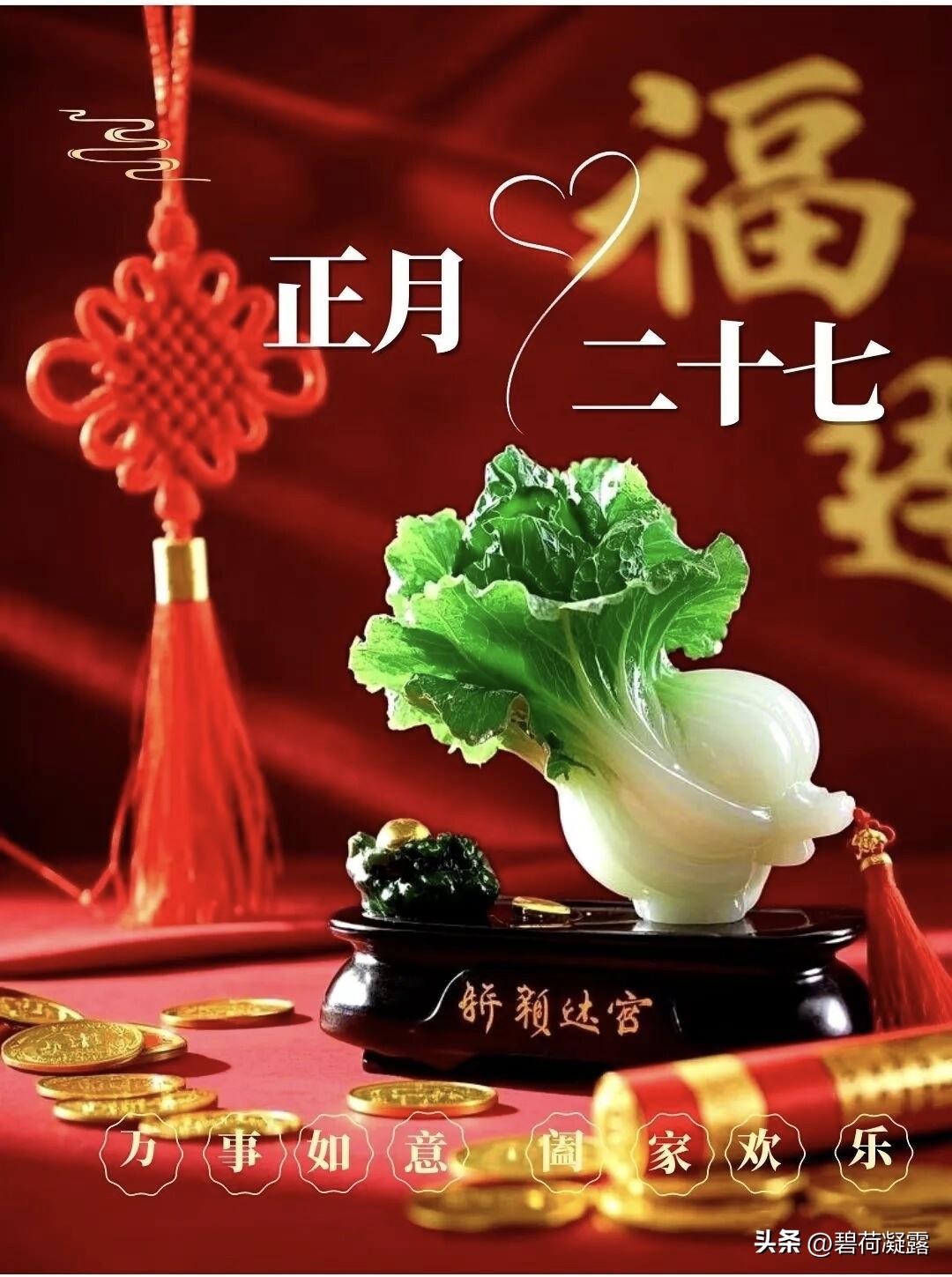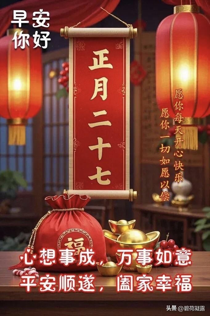 今日正月二十七,祝您七星高照,八方来财,久久安康,万事胜意,祝您生活顺风顺水,钱财无忧,心情舒畅,愿每天都能笑容满面,万事随心,事事顺心!