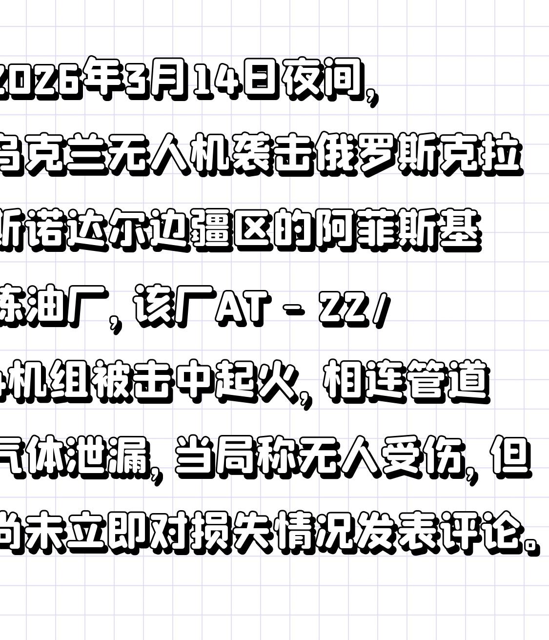 2026年3月14日夜间,乌克兰无人机袭击俄罗斯克拉斯诺达尔边疆区的阿菲斯基炼油厂,该厂AT - 22/4机组被击中起火,相连管道气体泄漏,当局称无人受伤,但尚未立即对损失情况发表评论。
