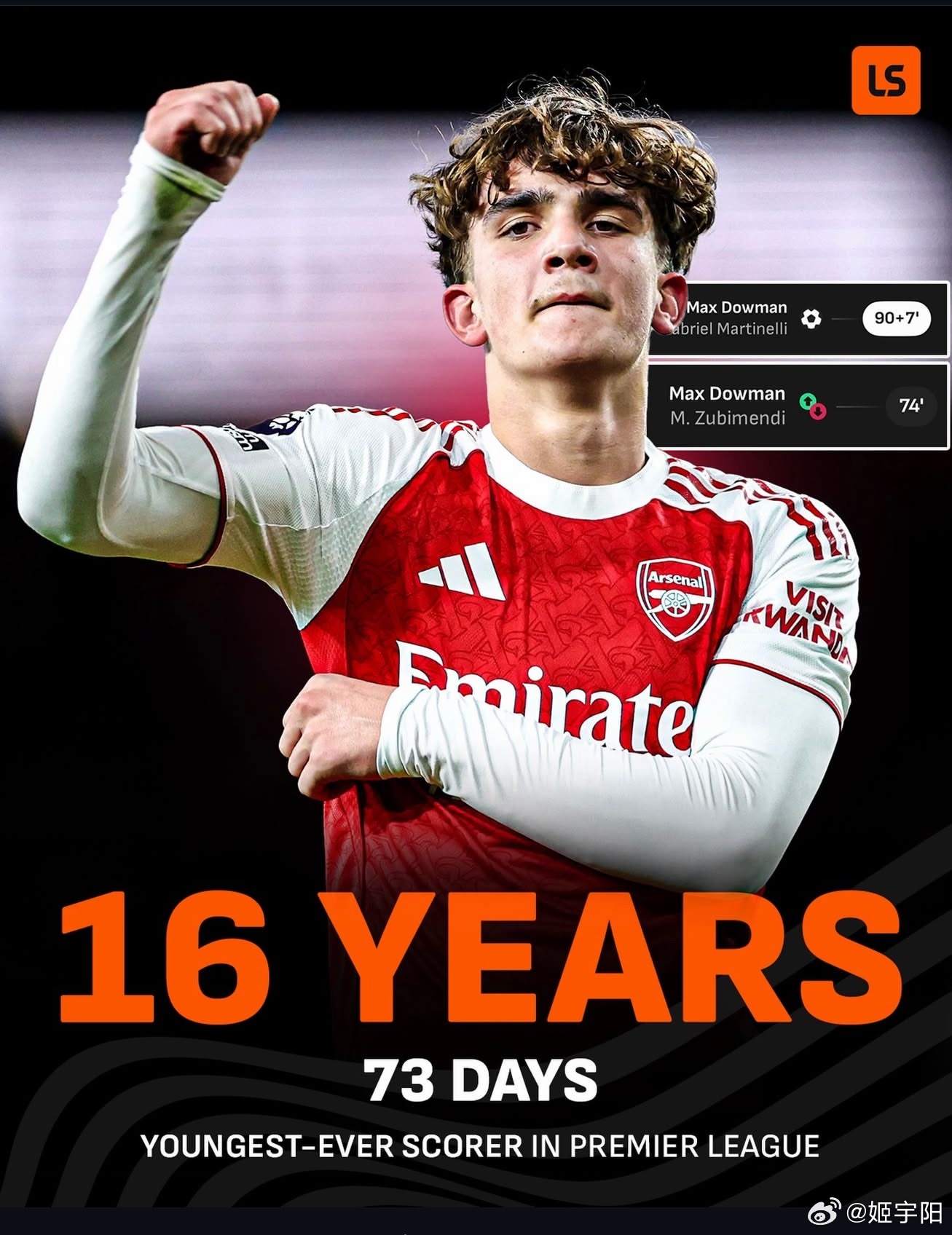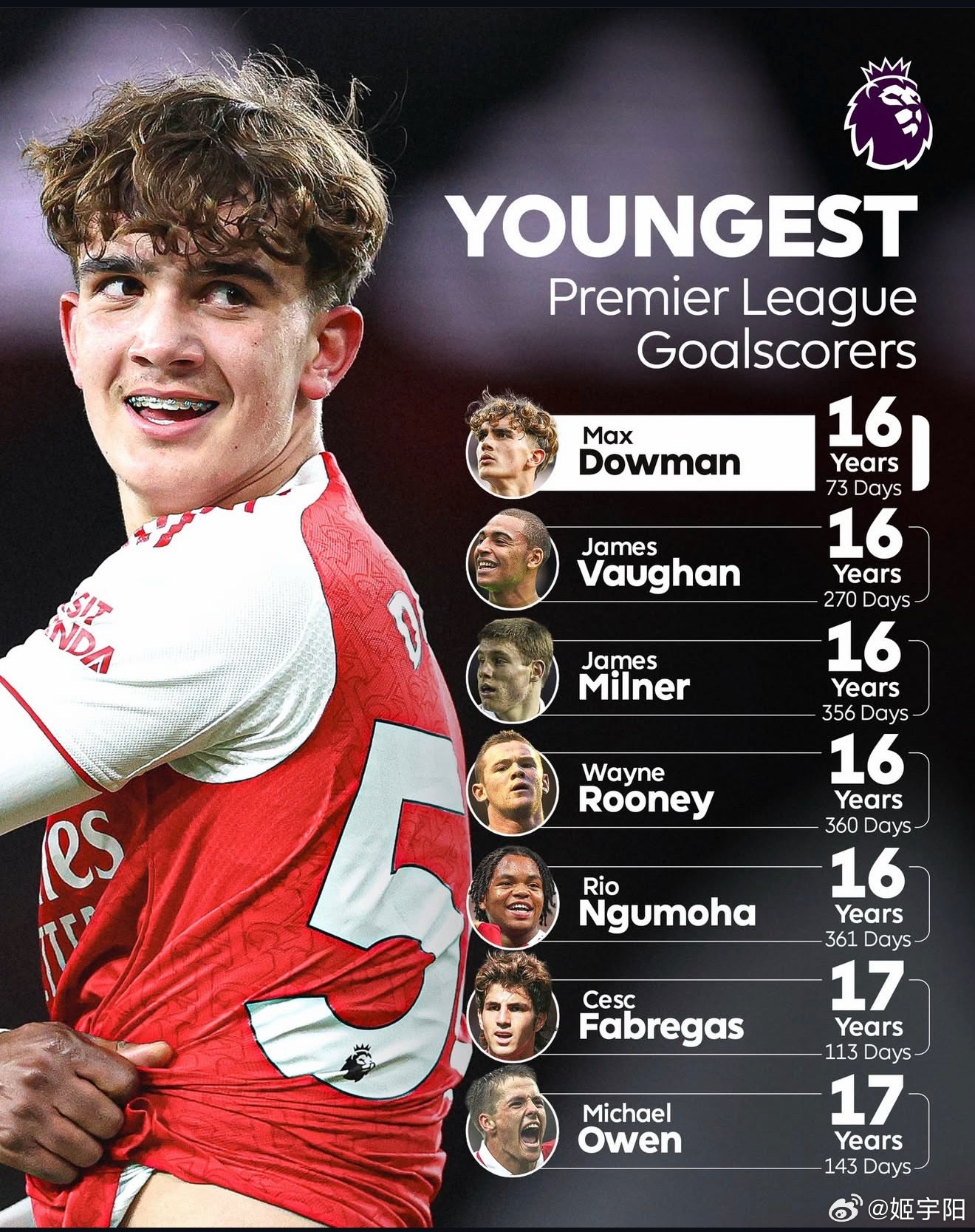 2 比 0 战胜埃弗顿的比赛,阿森纳不仅扩大了领先优势,顺便还创造了一项英超新纪录!第 74 分钟被换上、97 分钟完成进球的的阿森纳小将道曼,以 16 岁 73 天的年龄,成为了英超历史上最年轻的进球队员!
