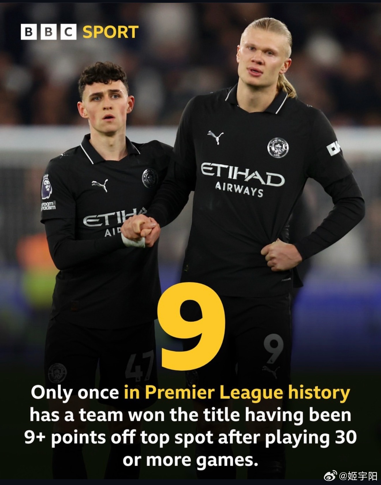 被西汉姆逼平的曼城落后榜首已达 9 分。英超历史上 30 轮打完落后 9 分的球队最终夺冠只发生过 1 次。当然,唯一那一次,做到的球队也正是曼城。