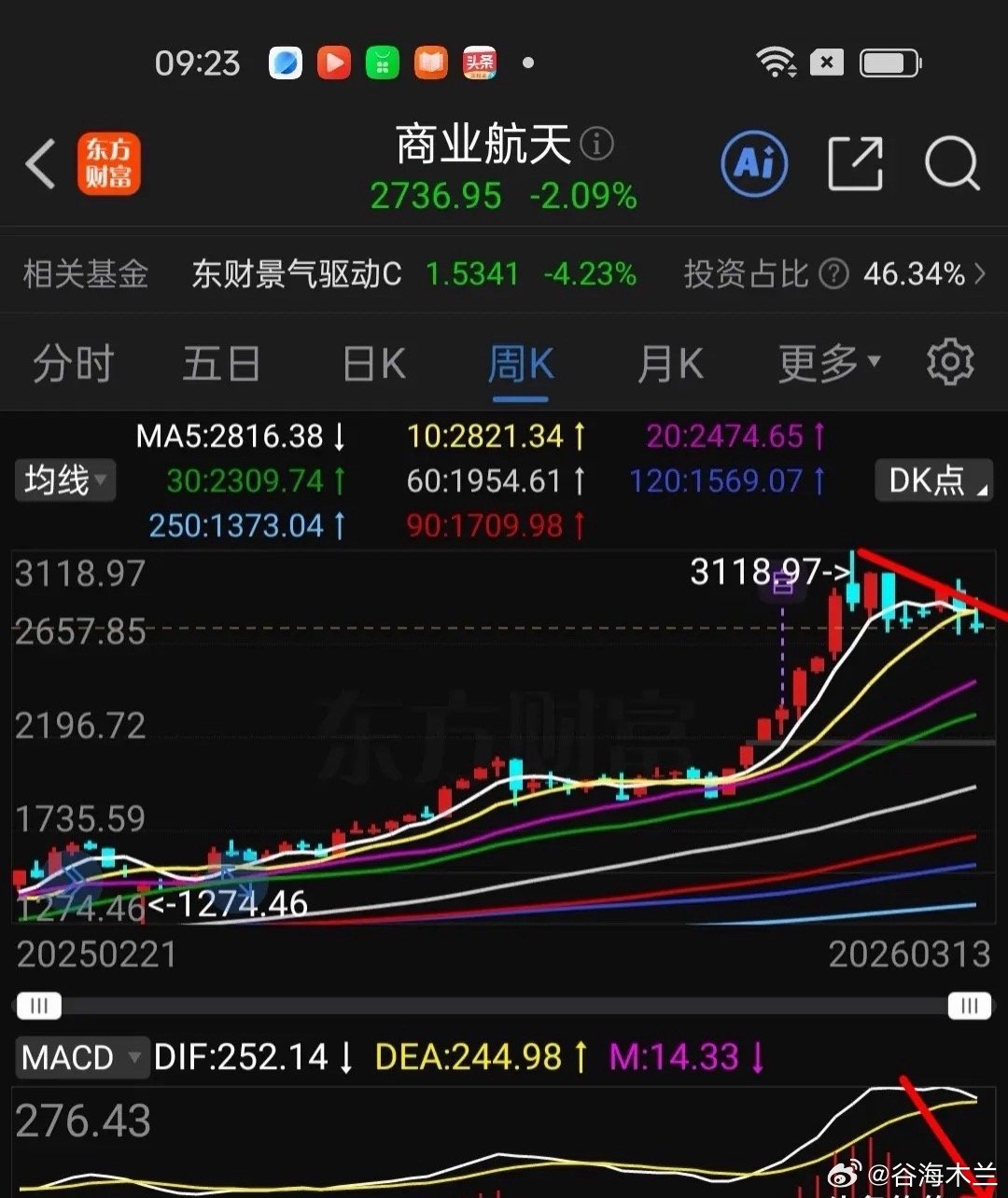 基金:下周大盘选择方向,基金如何操作? 周五化工 新能源车,基建地产白酒,大消费等少数板块涨幅居前。大数据,有色金属,AI应用,商业航天,金融科技,电网设备等板块跌幅较大。 上证指数日K线已经跌破了5-10-20-30日线支撑,日线级别的上涨趋势线已经破防,如果下周有效破位,那么短期风险加大。 创业板指数走势比上证指数好些,但是也没有摆脱日线下跌趋势,看下周能不能反弹,扭转这个日线下跌趋势。上证指数和创业板指春节后都是横盘震荡走势,包括春节前在内,横盘震荡时间够长了,A股有久盘必跌规律,下周很快就会进行方向选择。 如果方向选择向上,皆大欢喜,要加仓进场,如果方向选择向下,让人伤心,但是给了抄底介入机会。各个板块涨跌都与大环境及大盘指数趋势相关联,我们只能顺势而为! 下面简要分析一下商业航天趋势: 电网设备刚发了专题分析,可以去看看。 商业航天是让大家比较闹心的板块,年后套牢了不少人,对它的期望变成了失望,目前日线还处于短期震荡下跌通道中,下周看60日线支撑力度。 周线大趋势虽然还处于上涨趋势中,但是,5日线死叉10周线,macd红柱逐渐消失,周线回调刚刚开始,假如回调起来时间与跌幅比较大。持有它需要做好长期战斗的思想准备,短线先不要再进场。