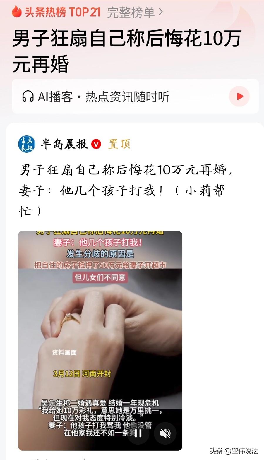 妥妥的恋爱脑!河南开封,56岁男子花10万彩礼娶了二婚妻子,婚后,妻子说想开个超市,他二话不说就将自己的房子抵押,贷款50万给了对方。这下,他的三个孩子不干了,这房子是他唯一的财产,里面还有母亲的一部分,凭啥拱手送人,这不明显被忽悠了吗?双方为此发生争执,女儿一气之下还提起板凳砸了后妈。这下,妻子哭着跑回了娘家,还要离婚。男子左右为难,狂扇自己耳光,直呼后悔。 吴师傅今年56岁,去年觉得自己撞了大运,二婚娶了个媳妇,按他的话说,他的人生开了第二春。 可这第二春才过了一年,就变成了寒冬腊月。 吴师傅和现在的妻子都是二婚,去年经人介绍认识,一见如故,认识没多久就领了证。 为了表达诚意,吴师傅按照头婚的规格,给了女方10万元彩礼,寓意万里挑一,还带她置办了首饰、新衣服等。 吴师傅那时候是真高兴,逢人就说自己遇到了真爱,后半辈子有盼头了。 婚后,两口子合计着干点啥,妻子说想开个超市,手里没本钱,吴师傅一琢磨,妻子想挣钱是好事,必须得支持。 可他自己也没啥积蓄,一咬牙,竟然把自己的房子抵押出去,贷了50万,全给了妻子张罗超市。 当时想着两个人已经领证结婚,不分彼此,谁知,钱给出去后,矛盾也跟着来了。 吴师傅的几个孩子不干了。在他们看来,当时给十万彩礼就不说了,但这房子是老爹的命根子,他一辈子啥也没攒下,就奋斗了这套房子。 而且,里面还有他们母亲的一部分,也是以后他们唯一能继承的家产。 现在老爹脑子一热,抵押贷款给后妈做生意,这不是纯纯恋爱脑,被人忽悠了吗?这种情况太多见了。 但吴师傅不这么想,他认为,自己既然再婚,就应该为妻子着想,为他们的新家付出,几个孩子都大了,他也该享受自己的生活。 几番争执下来,孩子们和后妈的关系越来越僵。 真正闹崩的那天,是在家里。吴师傅的大女儿和妻子吵了起来,话赶话越说越难听。 吵到激烈处,大女儿抄起手边的板凳,照着后妈头上砸了过去,这一下,彻底把家砸散了。 妻子挨了打,当天就收拾东西回了娘家,临走撂下话:这日子没法过了。 吴师傅夹在中间,两头不是人。一边是亲生的孩子,一边是刚娶过门的媳妇。他试着劝,劝不动;试着拉,拉不住。 折腾了一个多月,妻子不但不回来,还根本就不理他了。 实在没辙了,吴师傅向记者求助。在镜头前,这个56岁的男人情绪崩溃,说着说着就开始扇自己耳光,啪啪响。 “我是不是被耍了?她是不是根本就没想跟我好好过?”他红着眼问记者,脸上全是懊恼和痛苦。 随后,记者帮着联系上了吴师傅的妻子。 电话那头,50岁的妻子也一肚子怨气∶他不把我当一家人。我在他家,过得还不如一条狗。他闺女指着我鼻子骂,拿板凳砸我脑袋,这事儿就这么算了? 她提了个条件,打人的三个孩子,必须当面给她道歉,道了歉,她就回去。 一场因为50万贷款、一个板凳引发的婚姻危机,最终被推到了“道不道歉”的关口。 只是不知道,这声“对不起”说出口之后,那个曾经让吴师傅觉得“开了第二春”的家,还能不能回到从前。 中年再婚,真不是两个人的事,而是两个家庭的重组,它最大的坎儿其实不是两个人有没有感情,而是“旧账”能不能理清。 吴师傅一激动把房子抵押了给二婚妻子开店,这份心是真的,但做法太冒险了。 孩子们为啥急眼?因为他们会觉得,这里有他们母亲的遗产,也是他们以后能继承的财产,老爹一昏头就给了外人。 这种矛盾,婚前要是没摊开来谈过,给婚后肯定埋了雷。 《民法典》第三百零一条规定:处分共有的不动产或者动产以及对共有的不动产或者动产作重大修缮、变更性质或者用途的,应当经占份额三分之二以上的按份共有人或者全体共同共有人同意,但是共有人之间另有约定的除外。 吴师傅擅自抵押的房产,包括前妻份额,属家庭共同共有财产,吴师傅未经全体共有人同意擅自抵押房屋贷款,已构成无权处分。 该处分行为侵害其他共有人合法权益,依法可被主张撤销或确认无效。 但是,其女儿持板凳殴打继母的行为涉嫌违法侵权,应承担相应民事赔偿乃至行政、刑事责任,不能以家庭矛盾为由免除法律责任。 少来夫妻老来伴,五十岁的人了,再婚就应该图的是有个知冷知热的伴儿,心里千万不敢打小算盘,不然,这日子过不长久。