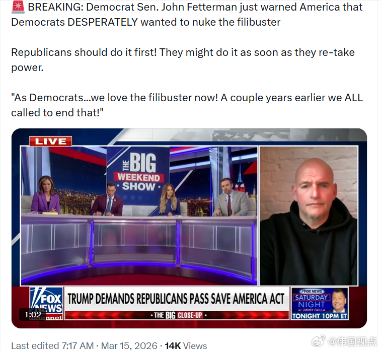 民主党参议员费特曼刚刚警告称,民左党曾经非常迫切地想要废除“冗长辩论”规则。