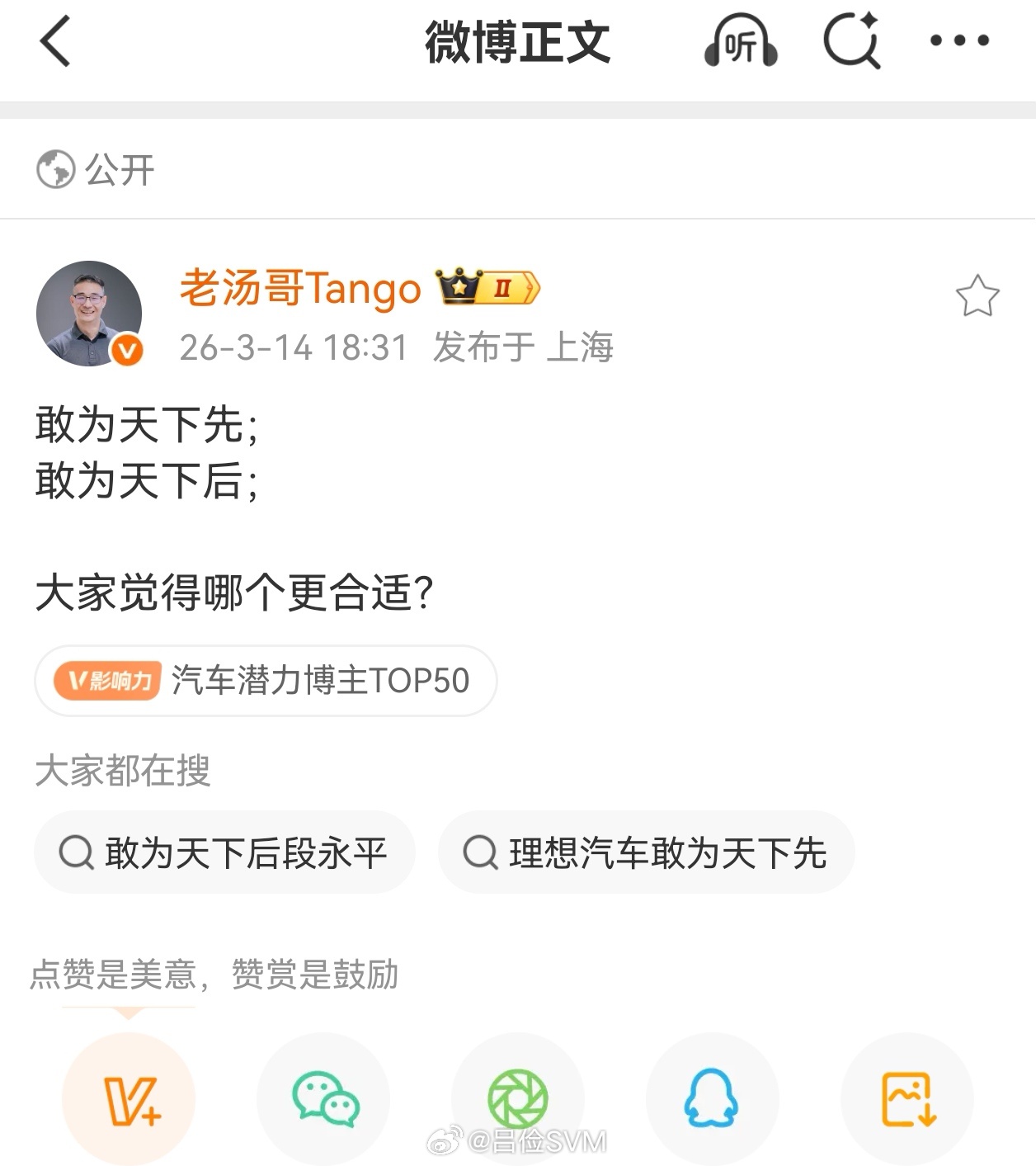 汤哥的问题很好,“敢为天下先还是后”,回响了。理想汽车