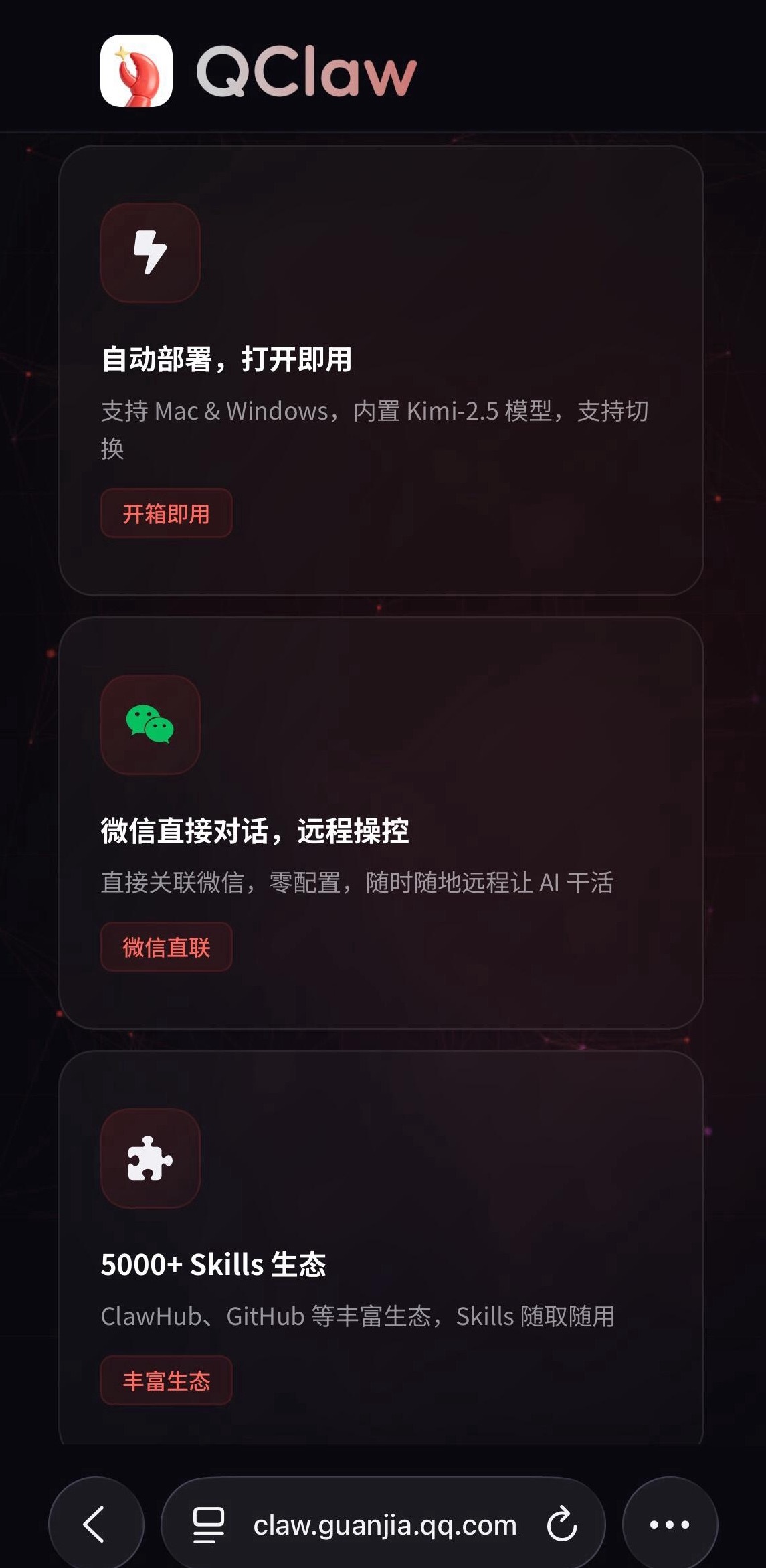 还是腾讯动作快,OpenClaw热度刚起来,腾讯就整了个QClaw出来。目前还在内测阶段,支持Windows和Mac,App还没上线。有个大优势是限时Token免费!内置了Kimi 2.5,支持切换,最关键的是微信直连、本地部署、开箱即用,不用折腾配置了。等上线后就体验一下,感觉会很香qclaw