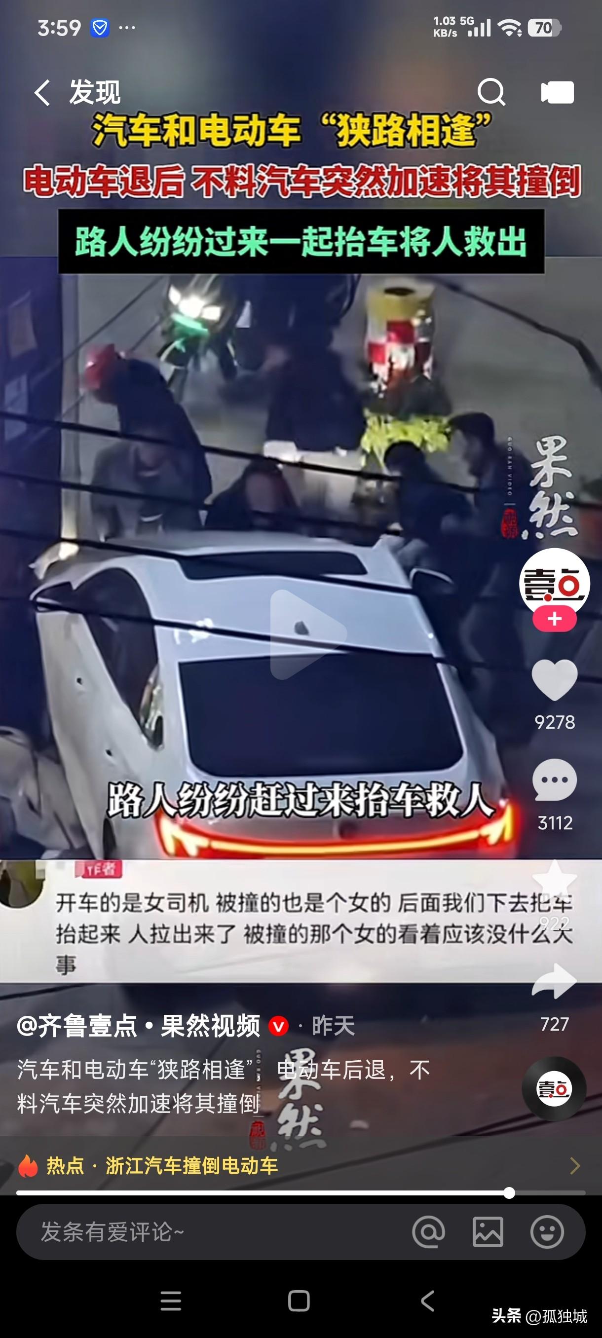 汽车和电动车偶遇狭路相逢,电动车立即后退给汽车让路,让人万万没想到的是汽车突然加速把电动车撞倒直接压在了车下,路人合力帮忙把汽车抬起拉出被撞的电动车主。 这是狭路相逢勇者胜的操作吗?这汽车车主是不是把刹车当油门踩了?电动车都后退给你让路了,你为什么还这么狠呢?你看把人家给撞成什么样了?同样都是女人,女人何苦对女人这么狠呢?不知道这被撞的电动车主有没有大碍,希望她并没有什么大问题吧,她无论如何都没有想到自己两轮给人家四轮让路,瞬间被四轮给撞倒压在了车下,这究竟是自己出门没看黄历还是开车的技术不行? 并不是所有的人都适合开车不是吗?像这种把刹车当油门的车主,开车不是害人又害己吗?接下来是不是给女子既要检查身体?又要赔偿电动车了?