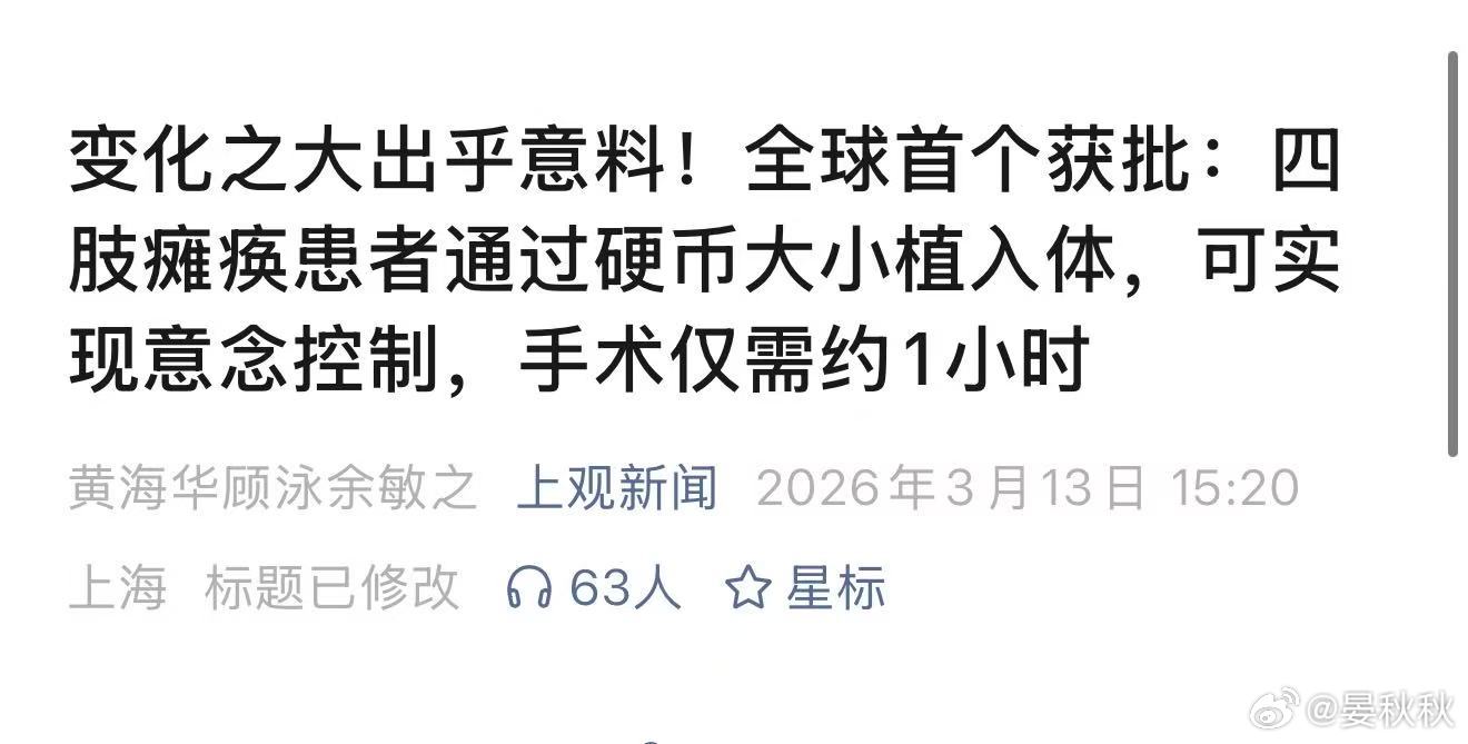 上海搞了一个“全球第一”,和脑机手术有关,更和老百姓息息相关。它进一步证实,人类正处于医学和科技突破的前夜,未来人类“有质量的寿命”将大大增加。根据“上观新闻”,上海一个能让瘫痪病人用“想法”控制“动作”的神器,刚刚拿到了国家药监局的“准生证”。它是全球第一个获批上市的同类产品。你可以把它想象成一个超级精密的“意念翻译器”。有些人因为车祸等意外,脖子以下的神经断了,大脑想动手,但命令传不下去,手就动不了。现在,医生通过大约一小时的手术,在病人头骨上开一个硬币大小的口子,把一个同样大小的“信号接收器”放进去,贴在保护大脑的那层膜外面。这个东西不伤脑子,却能“听”到大脑里的微弱“电信号”。然后,它把这个信号无线传出来,经过解码,就能控制一个戴在手上的气动手套。病人只要在脑子里想着“抓”,手套就能帮他完成抓杯子喝水、拿笔写字、拿葡萄吃这些动作。这个东西有多厉害?一位瘫痪了六年的小董,手术后一个月,就能自己拿起杯子喝水了。更神奇的是,经过训练,他后来甚至能不戴手套,扶着另一只手,写下了自己的名字和“谢谢”两个字。连做手术的华山医院医生都说,这几年看到的变化,常常让他感到“出乎意料的万分惊喜”。这件事,给全球数百万瘫痪患者,带来了实实在在的希望,让他们有可能重新自己吃饭、喝水,找回生活的尊严。更重要的是,它标志着人类“读懂”大脑运动指令,迈出了第一步。这扇门一打开,未来就可能让失语的人重新“说话”,让渐冻症不再是绝症,甚至探索更多人与机器交互的新方式。此外,脑机接口还有好几种“玩法”。在上海,这方面是“百花齐放”。华山医院:除了上面说的那种(电极贴在大脑表面,叫“半侵入式”),还在做把整个系统(含电池)都植入体内的“全植入式”,能让失语者用意念“说话”;还有跟中科院合作的、把更精细的电极插入脑组织的“侵入式”,信号更精准。中山医院:主攻“脑脊接口”,简单说就是在大脑和脊髓之间搭一座“桥”,绕过受伤的神经,让截瘫患者的大脑信号直接刺激腿部神经,从而实现重新站立和行走。瑞金医院:重点研究用脑机接口来治疗难治性抑郁症、强迫症这些精神疾病,通过调控大脑异常的电活动来缓解症状。还是那句话,请病痛者耐心等待。曙光已现,胜利就在前方。