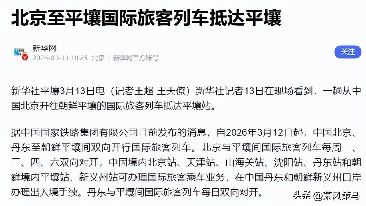 沉寂六年的汽笛终于响彻鸭绿江,中朝跨境客运班列正式重启,这可不是简单的交通恢复,而是东北亚局势里一记掷地有声的响锤! 朝方用最干脆的态度拍板定案,把信任的砝码压在中国身上,一句“放心让中国托底”,道尽了风雨同舟的底气。在半岛局势波谲云诡、外部势力频频搅局的当下,这条钢铁通道重新连通,比任何口头表态都更有分量。 货运不停、客运重启,人员往来打通最后一公里,商务洽谈、民间交流、边境贸易全都会跟着热起来,丹东等口岸城市即将迎来新的生机。这不仅是中朝友谊的务实延续,更是给动荡的区域局势注入了难得的确定性。 不搞花架子,只做实在事。两国用铁轨架起合作桥梁,以联通对抗割裂,以稳定对冲风险。这波操作,既守住了邻里情分,也稳住了发展根基,明眼人都看得懂,这才是真正的双赢! 中朝直通车 中朝边境旅游 中朝边境贸易