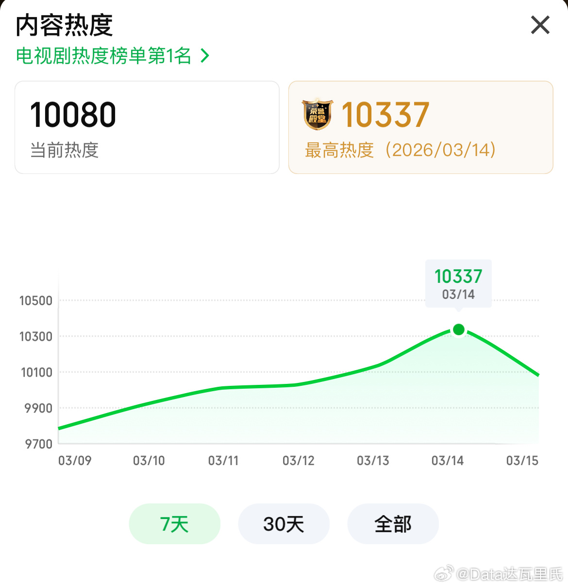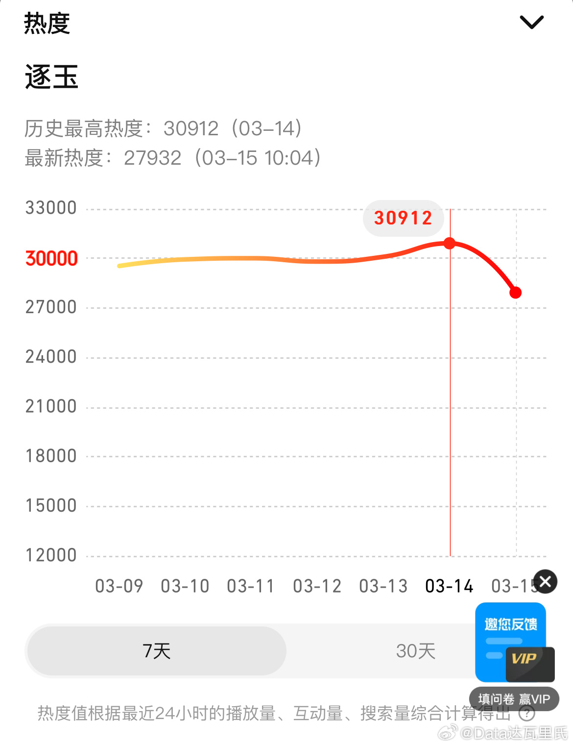 3.14逐玉热度 🐧腾讯站内热度最高30912,较前日+814🥝爱奇艺站内热度最高10337,较前日+199播放量预计增涨不小于1000万,酷云点播/云合双云破亿板上钉钉。