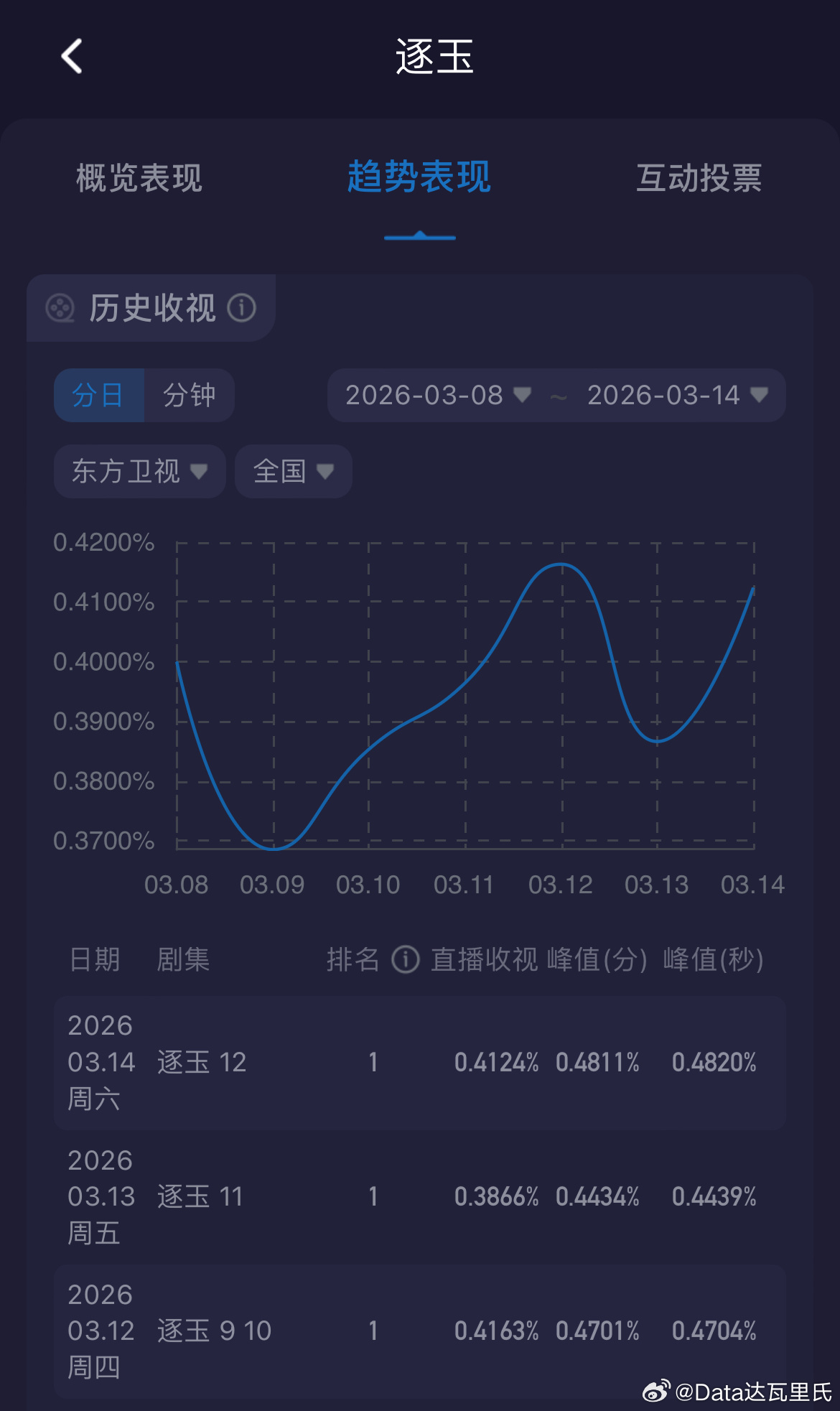 逐玉收视率 昨晚当期酷云收视0.413%1-12集酷云收视率集均0.3942%