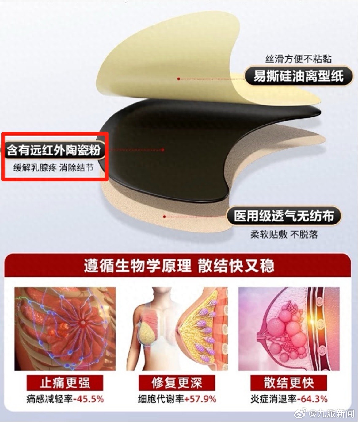 一位远红外贴代工厂负责人向九派财经记者透露,远红外陶瓷粉并非高科技,材料成本约为0.3元至0.5元/贴,加工费用约0.5元至1.2元/贴,主要靠吸收人体热量来发热,产品售价远高于成本。对此,湖北省肿瘤医院乳腺中心副主任医师郑红梅在接受九派财经记者采访时表示,此类热敷乳腺贴,不能实现“结节由大变小”或“消除结节”等效果。复旦大学附属肿瘤医院乳腺外科副主任医师杨犇龙也告诉九派财经记者:通过热敷或贴膏药来消掉结节的思路并不科学,大多乳腺结节其实并不是坏东西,并不需要想办法把它消掉。只有炎症结节才需要规范的中西医抗炎治疗来消除,且乳腺炎也不能靠任何远红外敷贴解决。而乳腺贴的上述宣传,可能给患者带来潜在风险。郑红梅医生说道,若结节本身存在恶性风险,长期依赖这类膏贴甚至可能延误诊断和治疗。“我们遇到过很多患者因接受不规范的赤脚中医治疗、包括使用这类各种敷贴,导致其原本能治愈的早期乳腺癌,被拖延成了晚期、肿块溃烂,”杨犇龙医生说道。