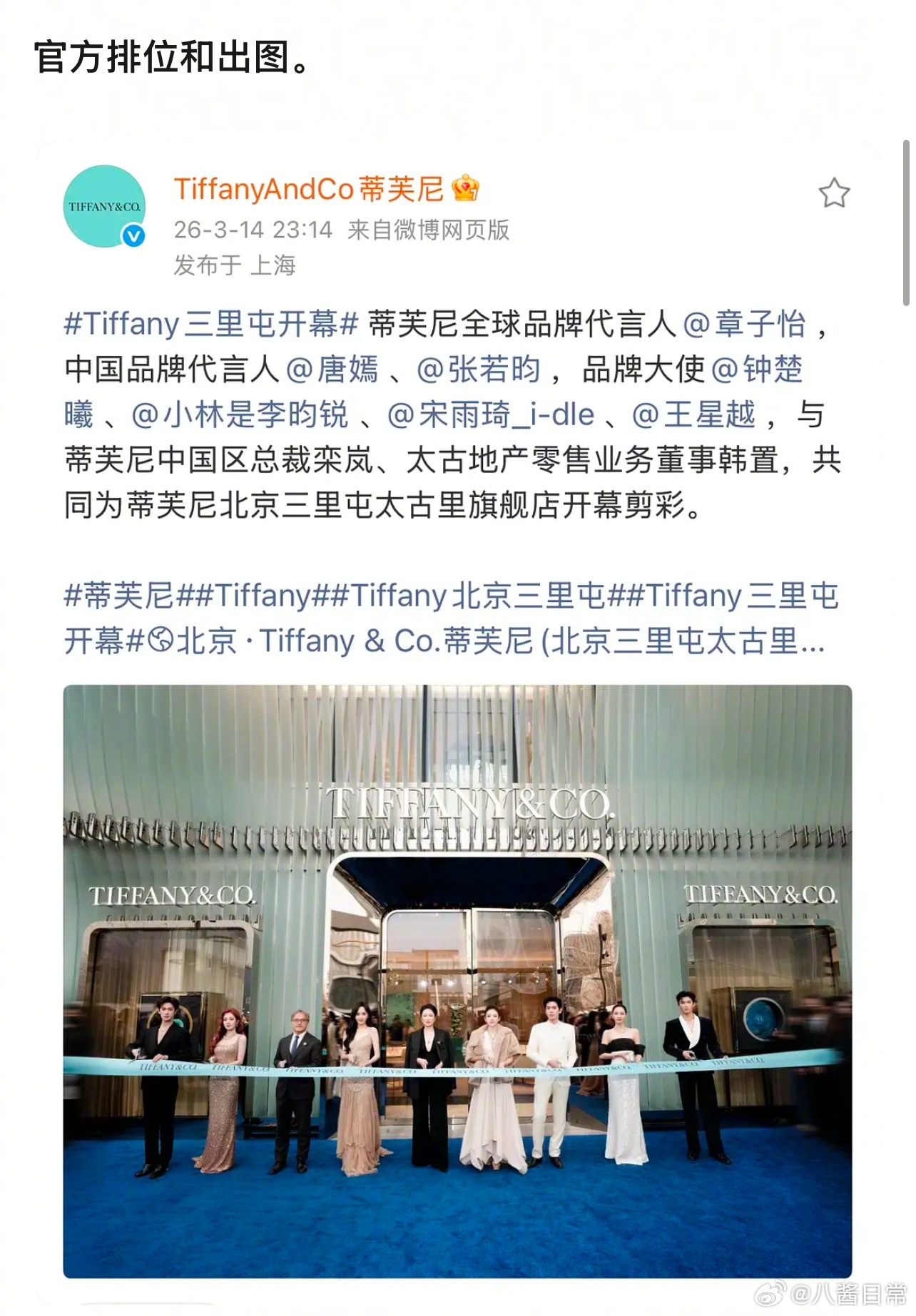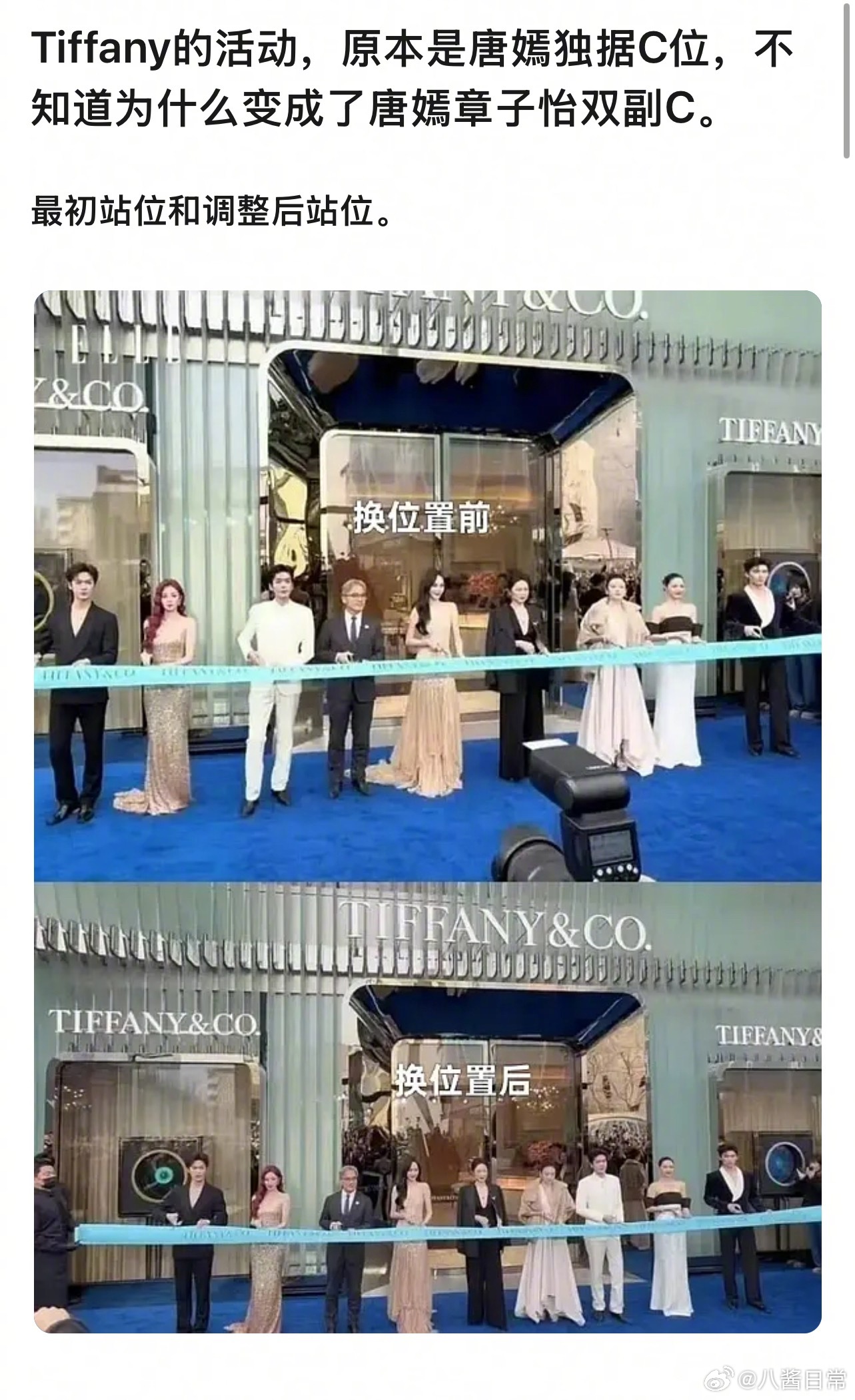 豆瓣说Tiffany活动原本是唐嫣独C,不知道为什么变成了唐嫣和章子怡双副C