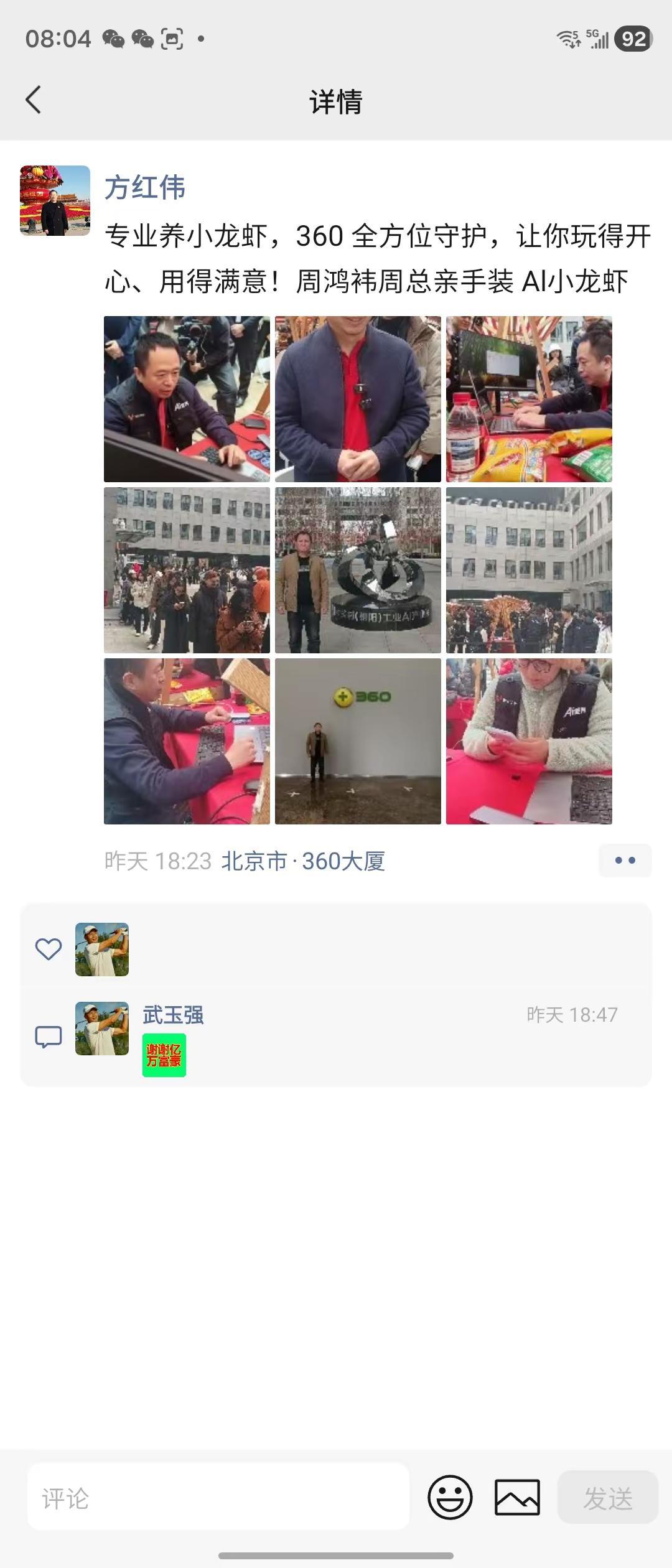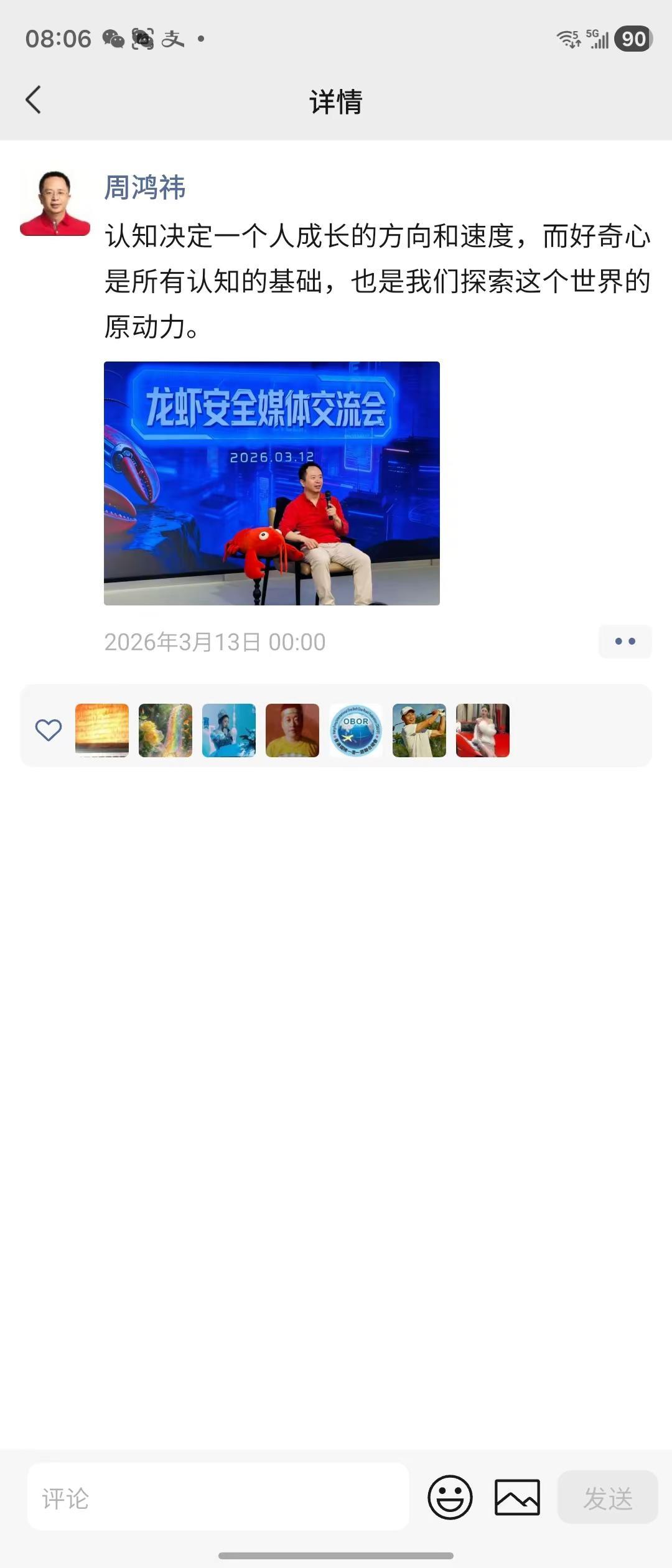 我和企业家朋友们:品牌起号之路[心][玫瑰][玫瑰][玫瑰]方红伟与红衣大叔周鸿祎专业养小龙虾,360 全方位守护,让你玩得开心、用得满意!周鸿袆周总亲手装 Al小龙虾认知决定一个人成长的方向和速度,而好奇心是所有认知的基础,也是我们探索这个世界的原动力。认知决定一个人成长的方向和速度,而好奇心是所有认知的基础,也是我们探索这个世界的原动力。