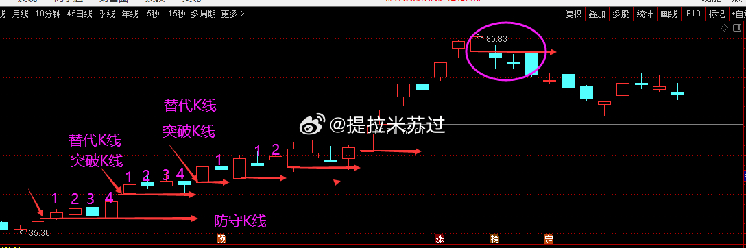 今天教你们,不看任何指标,只看K线图的方法。最下面的红色线,我称之为防守K线,只有今后任意一根K线都不跌破这根K线,无需关注量能,都可以不用卖出,这种粉色数字K线叫做“孕K线”他始终在左边最高价和最低价中间。 当某一天他的最高实体K线高于昨天的位置。那么这就是突破K线,那么把他当天的实体最低位画一个切线出来,这就是替代K线,替代之前最低那根防守线。以后就照葫芦画瓢方式,依次类推。 这种方法叫做,新高不止,上涨不停。当然股市没有只涨不跌的。什么时候卖出?止盈?减仓?那么就看啥时候跌破昨天的最低位。最起码就是减仓,然后在配合5日,10日这些指标决定去留。